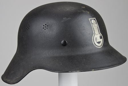 Scarce Luftschutz air raid helmet, black, two multi-holed vents on each side. The front of the helmet bears a 2 1/2" tall painted logo of the IG Farben chemical corporation. The beige felt-covered lining within, cork shock absorbers, tightening string and unique plastic chin strap are all in excellent condition. The inside rear of the helmet bears a decal indicating that the helmet meets the standards provided by law. The paint on the shell is excellent, bearing perhaps just five or six scuffs and chips, with one minor ding. A close collaborator with the Nazi government, IG Farben was involved in the planning of the invasions of Poland and Czechoslovakia to determine which chemical plants should be secured and delivered to IG Farben. Of course, the firm is most notoriously remembered as the inventor of Zyklon B and a major shareholder in the company which manufactured it.
