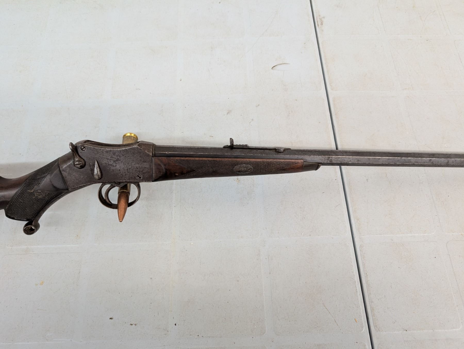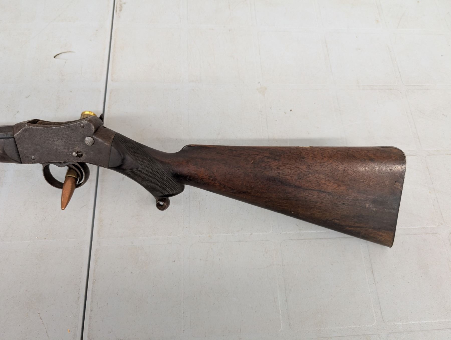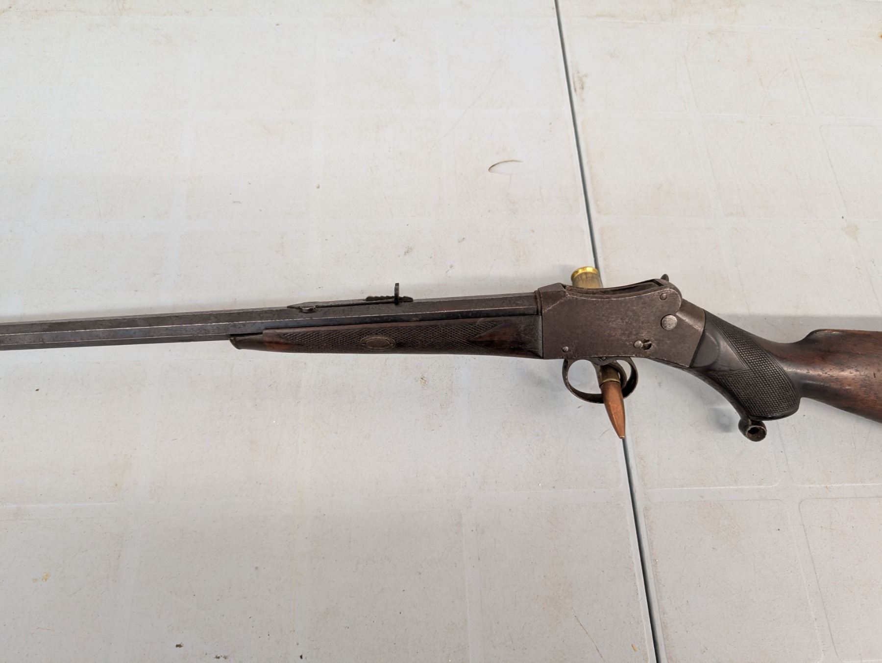 single shot falling block.Bore is shiny and bright. 26" Barrell. Rebarreled with a marlin Barrel. Stock is in excellent condition