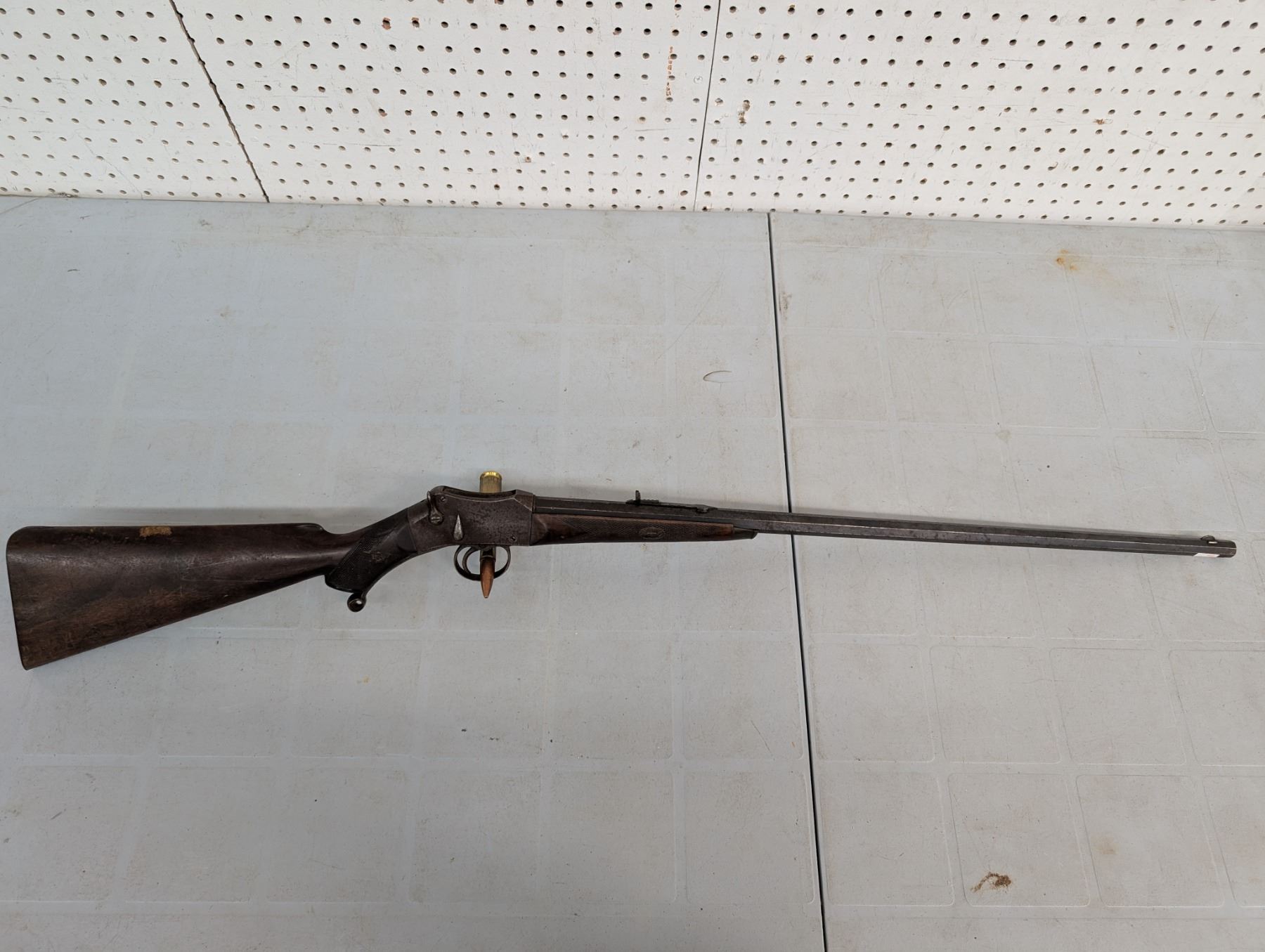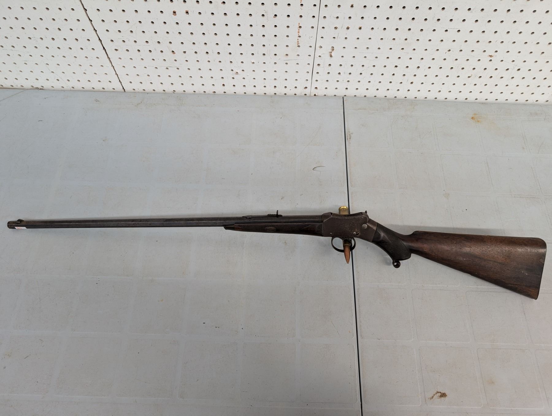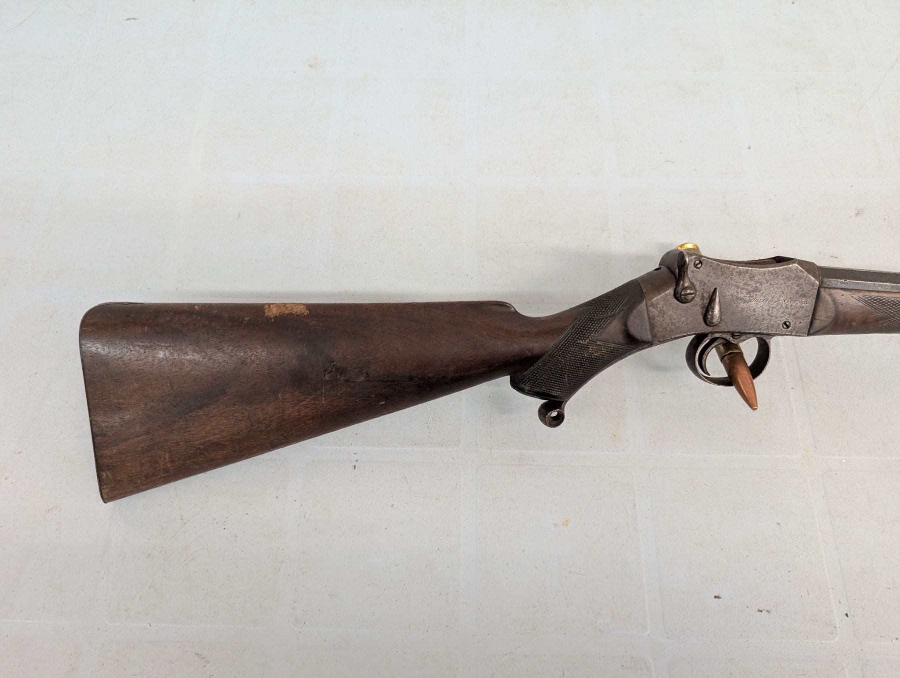 single shot falling block.Bore is shiny and bright. 26" Barrell. Rebarreled with a marlin Barrel. Stock is in excellent condition