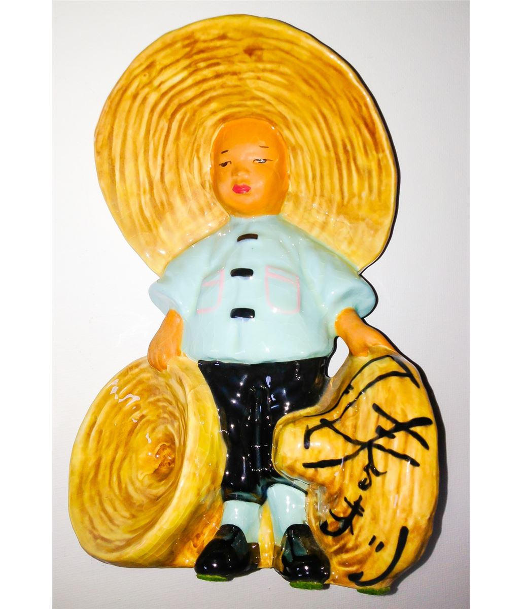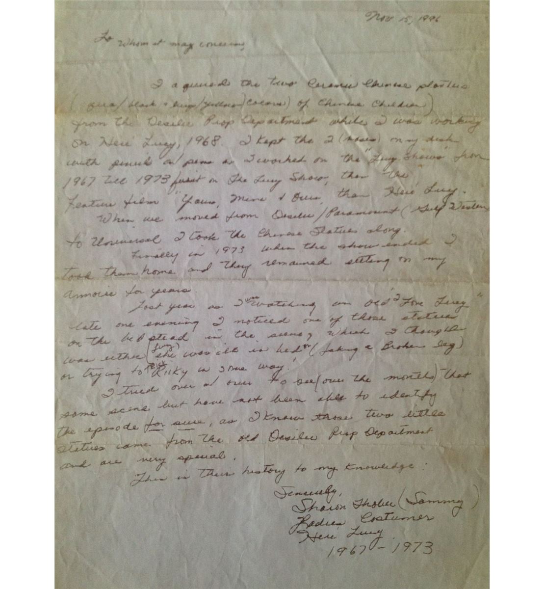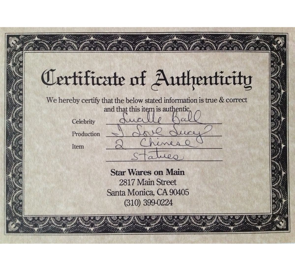 This ceramic Chinese statue was used on the the classic television show "I LOVE LUCY". Includes a certificate of authenticity from Premiere Props and a copy of a faxed letter of provenance from one of the people in charge of the props for the "I Love Lucy" shows. Measuring approximately 11 inches in tall.
