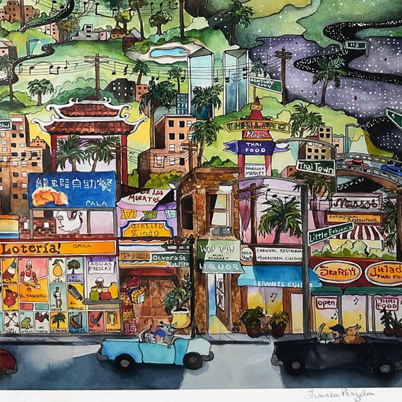 "I Love LA" is a limited edition giclee on paper by Linnea Pergola. The piece is designated from an AP edition, hand signed by the artist, and comes framed. Includes Letter of Authenticity. Measures approximately 21.5" x 27.5" (framed), 14.5" x 20.5" (image). There is minor wear on the frame.