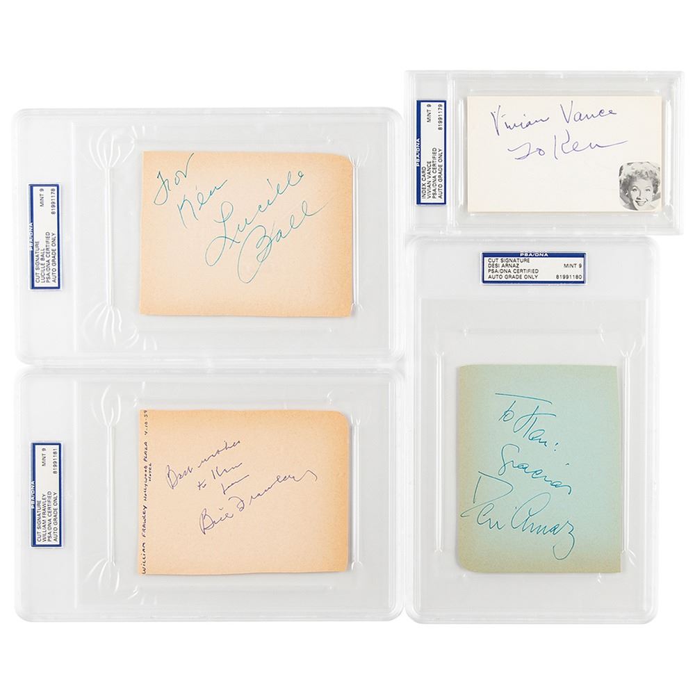 Fantastic group of four vintage ink signatures of the stars of I Love Lucy, all encapsulated and graded by PSA/DNA as "MINT 9." Penned on individual cards and album pages, ranging in size from 5 x 3 to 5.5 x 4.25, all are inscribed to "Ken." Includes: Lucille Ball, Desi Arnaz, Bill Frawley, and Vivian Vance. In overall fine condition.