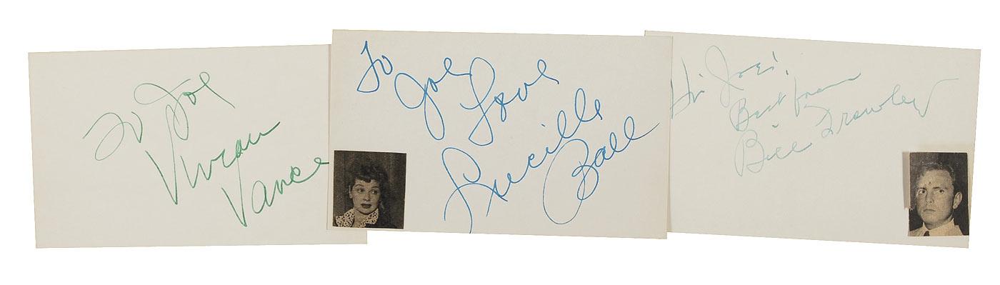Vintage in-person ink signatures and inscriptions of Lucille Ball, Vivian Vance, and Bill Frawley on individual off-white 5 x 3 cards, with small clipped photos of Ball and Frawley affixed to their cards. In fine condition.