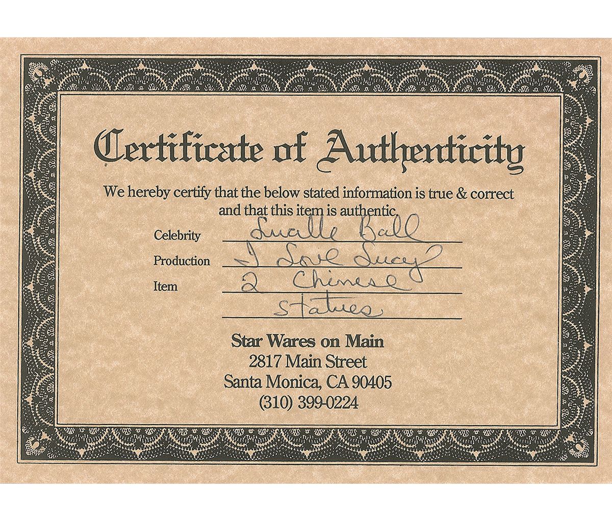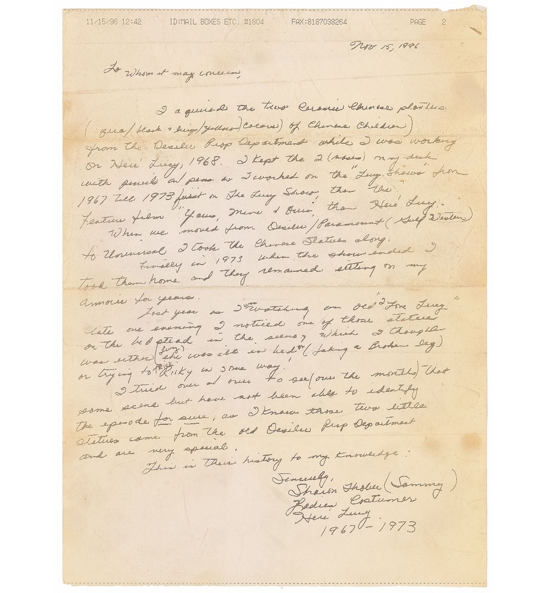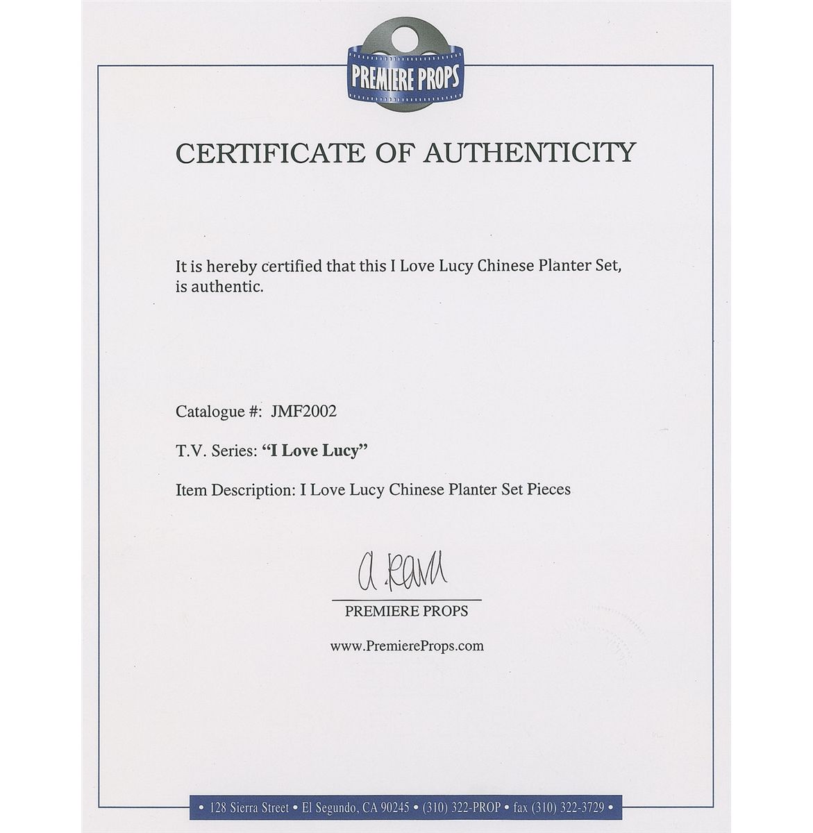 Two ceramic planters originally acquired from the prop department of Desilu Productions. Hand-painted figurines of two Chinese children, each standing approximately 7? tall, and marked on the bottom, “McCarty Bros © Calif,” with two 1946 dates. In very good to fine condition, with hat detached from one figurine, with the same figurine having several old repairs to bottom and lower portion, with one small chip missing. Accompanied by a 1996 faxed letter of provenance from Sharon Thober, the costumer from Here’s Lucy, which reads, in part: “I acquired the two ceramic Chinese planters…from the Desilu Prop Department while I was working on Here’s Lucy, 1968. I kept the 2…on my desk…as I worked on the ‘Lucy Shows’ from 1967 till 1973…When we moved from Desilu/Paramount…to Universal I took the Chinese statues along. Finally in 1973 when the show ended I took them home…last year as I was watching an old ‘I Love Lucy’ late one evening I noticed one of those statues on the bedstead in the scene, which I thought was either Lucy she was ill in bed (faking a broken leg) or trying to trick Ricky in some way.” Also accompanied by certificates of authenticity from Premiere Props and Star Wares.