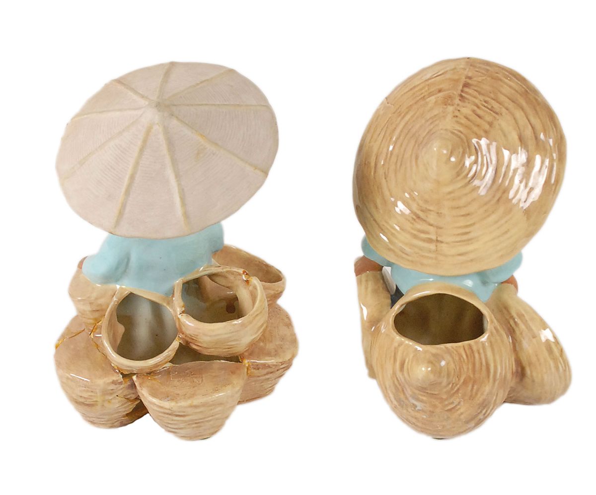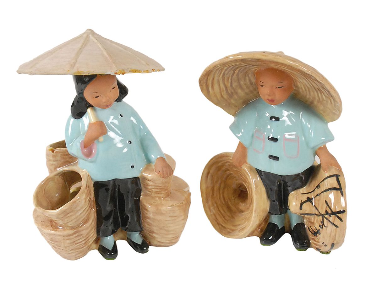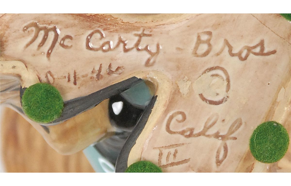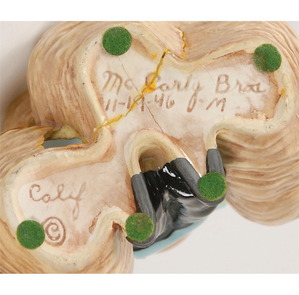 Two ceramic planters originally acquired from the prop department of Desilu Productions. Hand-painted figurines of two Chinese children, each standing approximately 7? tall, and marked on the bottom, “McCarty Bros © Calif,” with two 1946 dates. In very good to fine condition, with hat detached from one figurine, with the same figurine having several old repairs to bottom and lower portion, with one small chip missing. Accompanied by a 1996 faxed letter of provenance from Sharon Thober, the costumer from Here’s Lucy, which reads, in part: “I acquired the two ceramic Chinese planters…from the Desilu Prop Department while I was working on Here’s Lucy, 1968. I kept the 2…on my desk…as I worked on the ‘Lucy Shows’ from 1967 till 1973…When we moved from Desilu/Paramount…to Universal I took the Chinese statues along. Finally in 1973 when the show ended I took them home…last year as I was watching an old ‘I Love Lucy’ late one evening I noticed one of those statues on the bedstead in the scene, which I thought was either Lucy she was ill in bed (faking a broken leg) or trying to trick Ricky in some way.” Also accompanied by certificates of authenticity from Premiere Props and Star Wares.