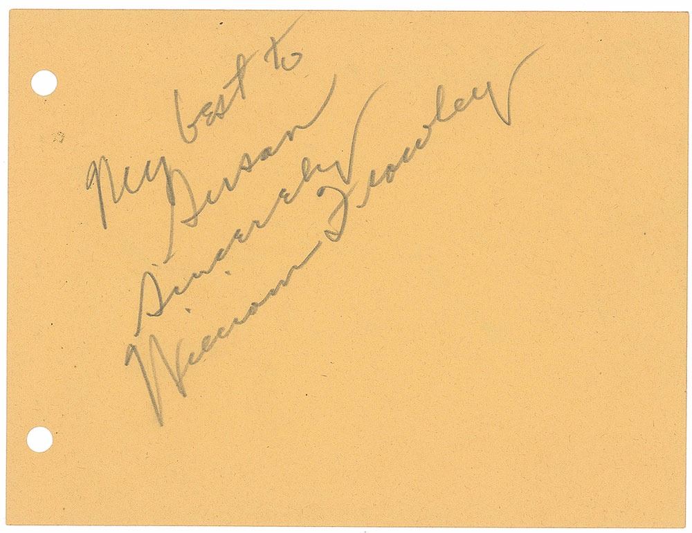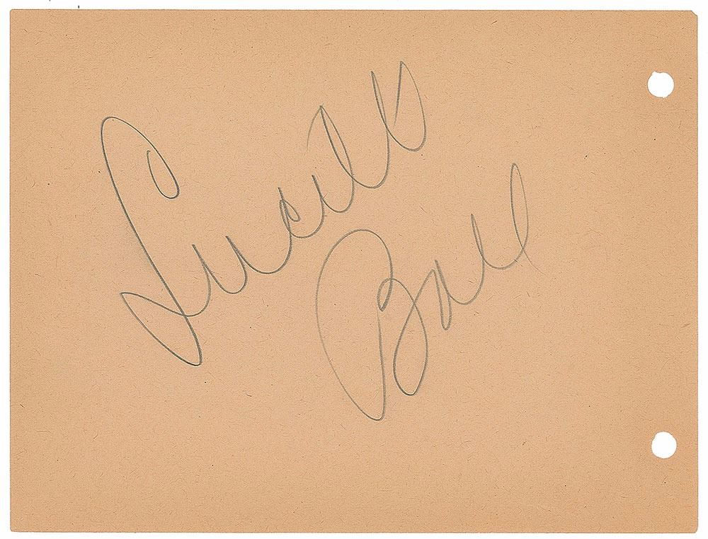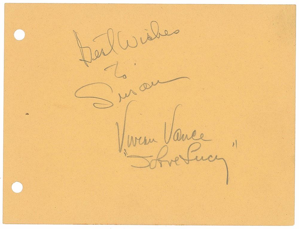 Set of three off-white album pages, each approximately 5.75 x 4.25, individually signed and inscribed in pencil, "Lucille Ball," "Best wishes to Susan, Vivian Vance, 'I Love Lucy,'" and "My best to Susan, Sincerely, William Frawley." In overall fine condition.