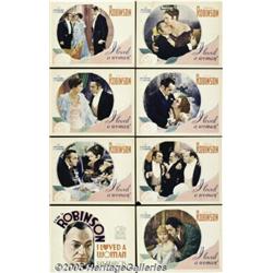<B>I Loved a Woman (Warner Brothers - First National, 1933)</B></I> Lobby Card Set of 8 (11" X 14"). Edward G. Robinson stars in this period piece as the heir to a meat-packing company, who marries a social climber, but falls for a girl working on her singing career. This set is in overall spectacular condition, with each card brandishing gorgeous deep colors. The majority of the cards have a pinhole in the center of the right or left border. The title card and one other portrait card have an additional pinhole in each corner. One scene has the lower left corner torn off. We can assure you that these imperfections are minor and don't take-away from the overall impact of how beautiful this set of cards is. Overall condition is Fine / Very Fine.