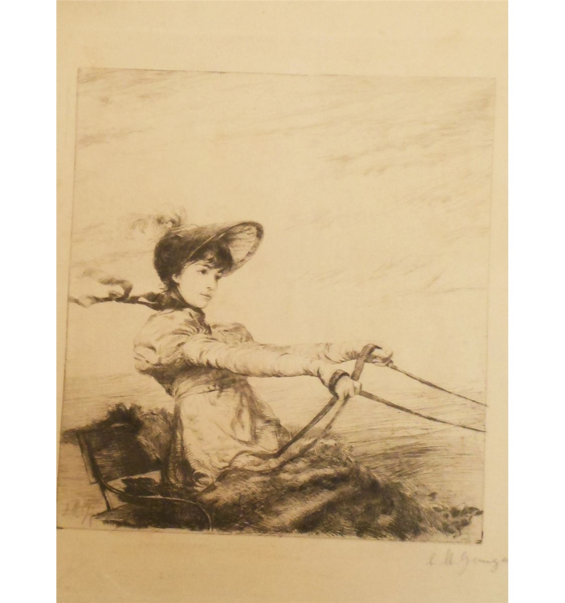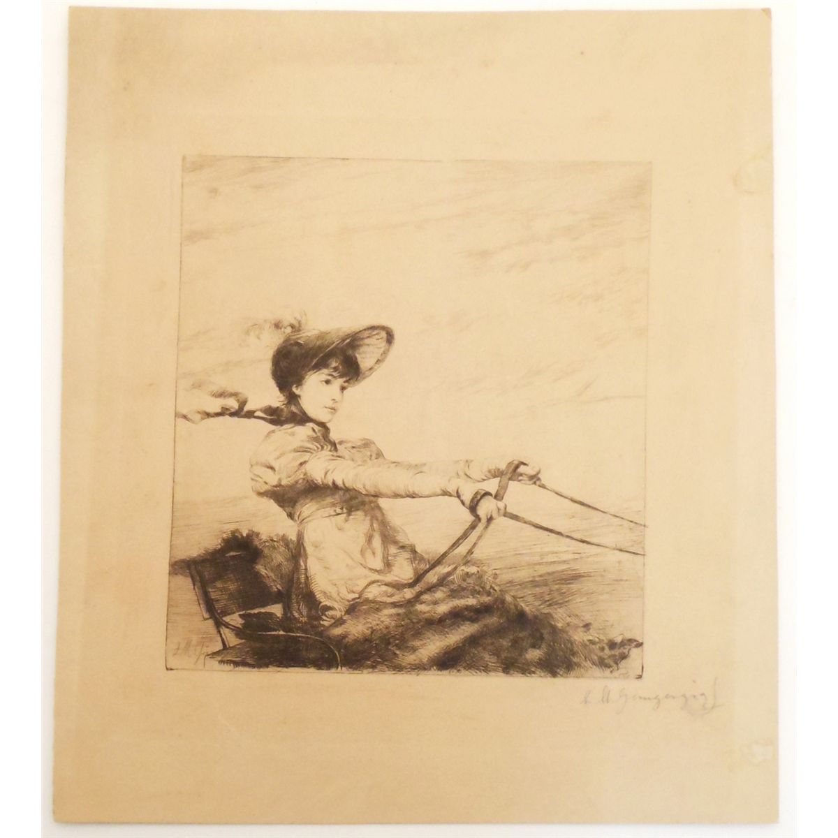 7" x 8" with margins on artist board, Ignaz Marcel Gaugengigl (1855-1932), signed in pencil in the margin, etching of woman guiding a carriage. Great condition with some browning.