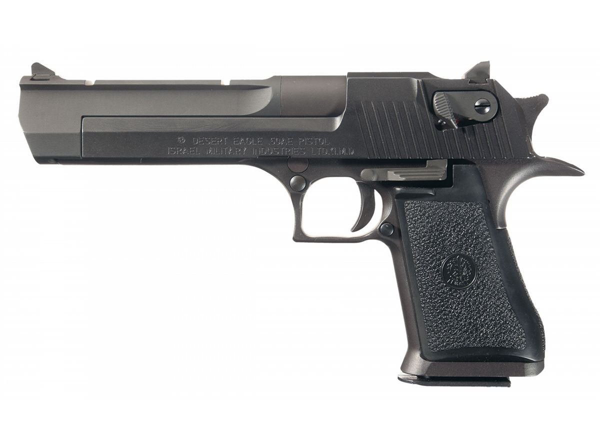 Drift adjustable front and rear sights, serrated slide stop, ambidextrous thumb safety, "2-91" dated magazine, textured I.M.I. wraparound grip, with Boyt nylon soft case.
