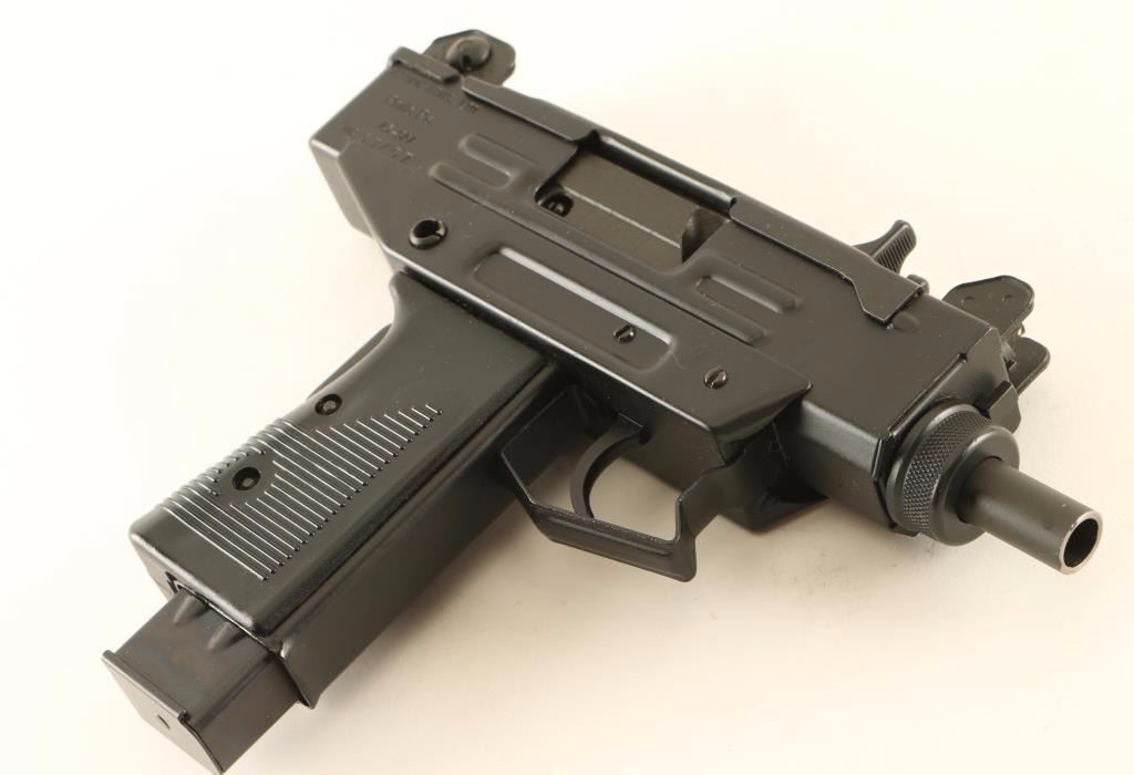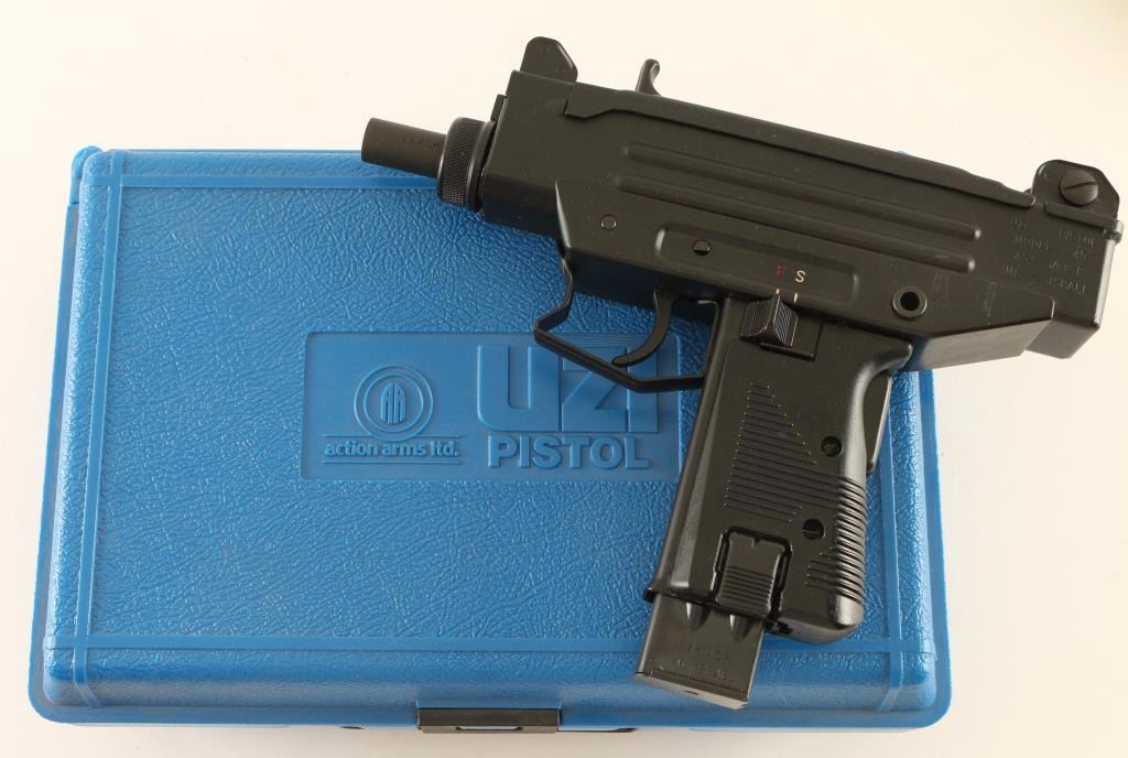 'Pre-ban' Semi-automatic pistol variant of the Uzi chambered in .45 Automatic, manufactures by Israeli Military Industries. Imported by Action Arms LTD of Philadelphia, PA with import marks on the receiver. Features a matte black finish, 4.5" barrel, shrouded adjustable three-dot sights, manual safety, grip safety, smooth trigger, 10 round factory magazine, stamped metal receiver and two-piece grooved black synthetic grips. Includes a factory hard case with manual and tool. Pistol exhibits approximately 99% of it's original matte black finish showing some minor handling marks/scuff with no major wear observed. Action is strong, bore is pristine and synthetic grips are fine. Condition is near new in box. ***Modern Firearm***