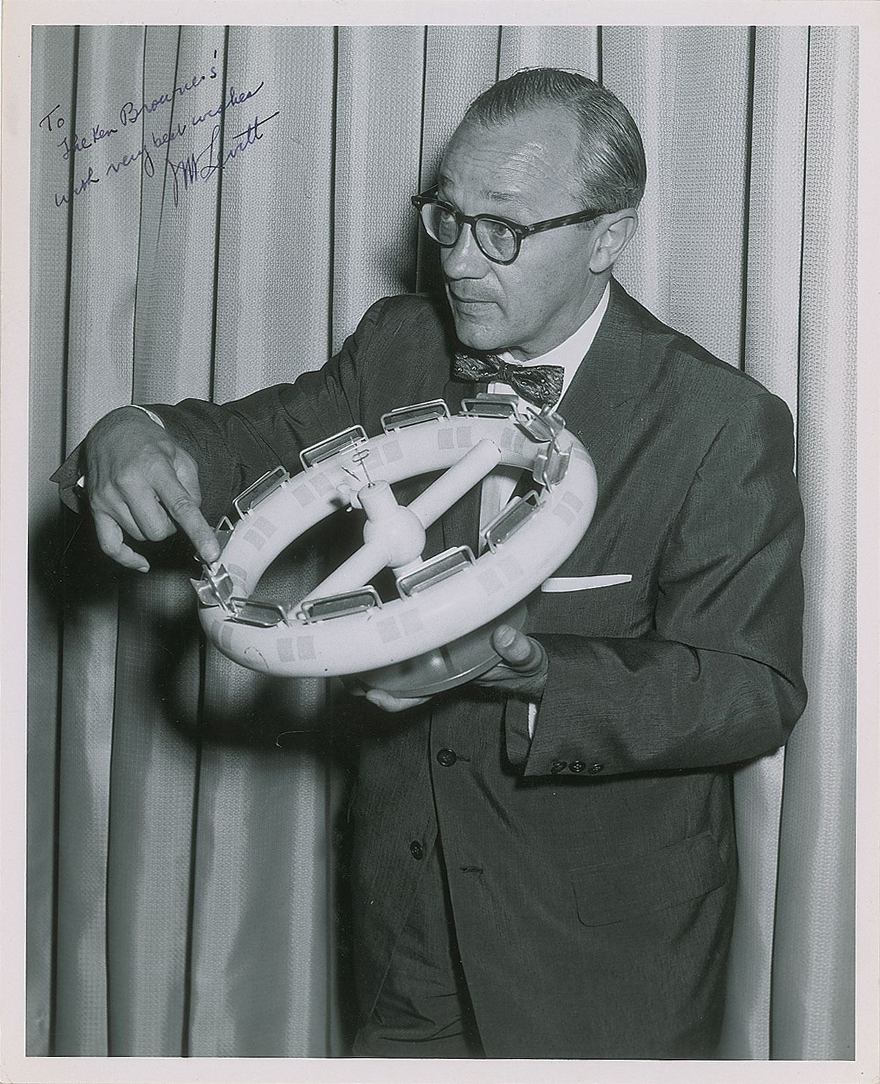 Astronomer-scientist (1907–2004) associated with the Franklin Institute, known for his pioneering work on the Martian clock and calendar. Vintage glossy 8 x 10 photo of Levitt holding a scale model, signed and inscribed in fountain pen, "To The Ken Browne's, with very best wishes, I. M. Levitt.” Reverse bears a typed collector's notation indicating that it was received in 1959. In fine condition, with a light paperclip impression to the top edge.