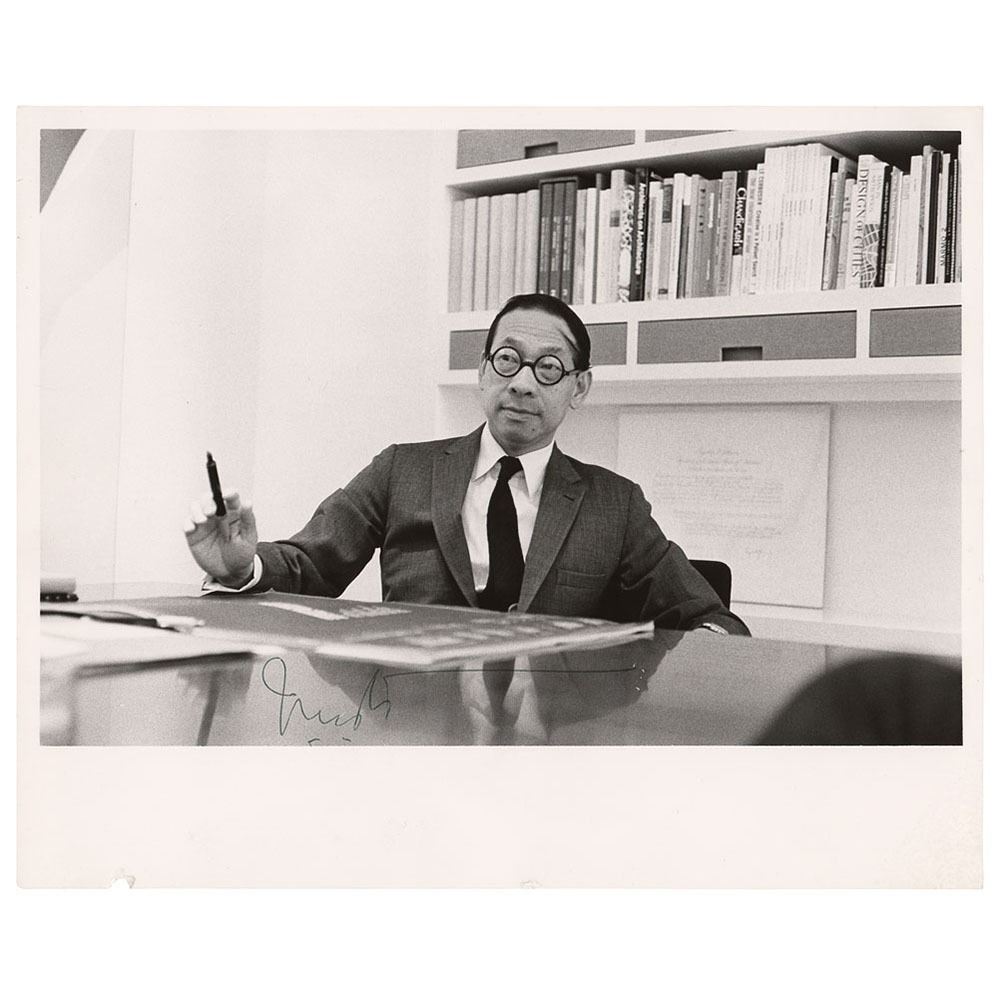 Well-composed glossy 10 x 8 photo of I. M. Pei at his desk, signed in black ballpoint. Reverse bears a Stuart Smith credit stamp. In fine condition, with three small dings to the bottom edge.