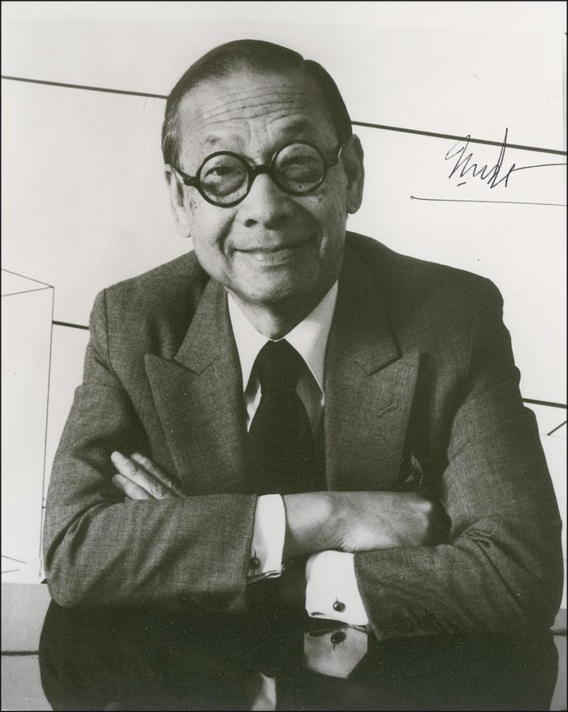 Iconic Japanese-American architect best known for his glass pyramid designed as an updated entrance to the Louvre. His other notable buildings include the Rock and Roll Hall of Fame in Cleveland and the John F. Kennedy Library in Boston. Matte-finish 8 x 10 photo, signed in black ballpoint. In fine condition, with trimmed vertical edges.