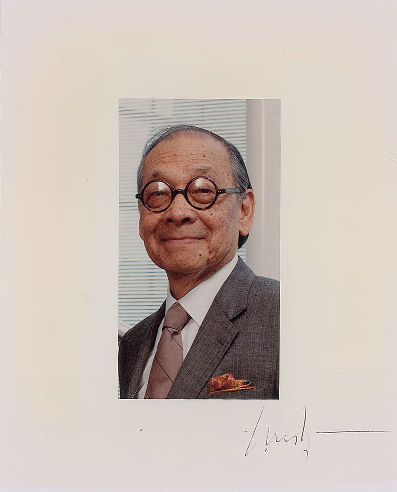Color satin-finish 8 x 10 photo of the famed architect, signed in the lower right in black felt tip. In fine condition, with some irregular adhesion to signature.