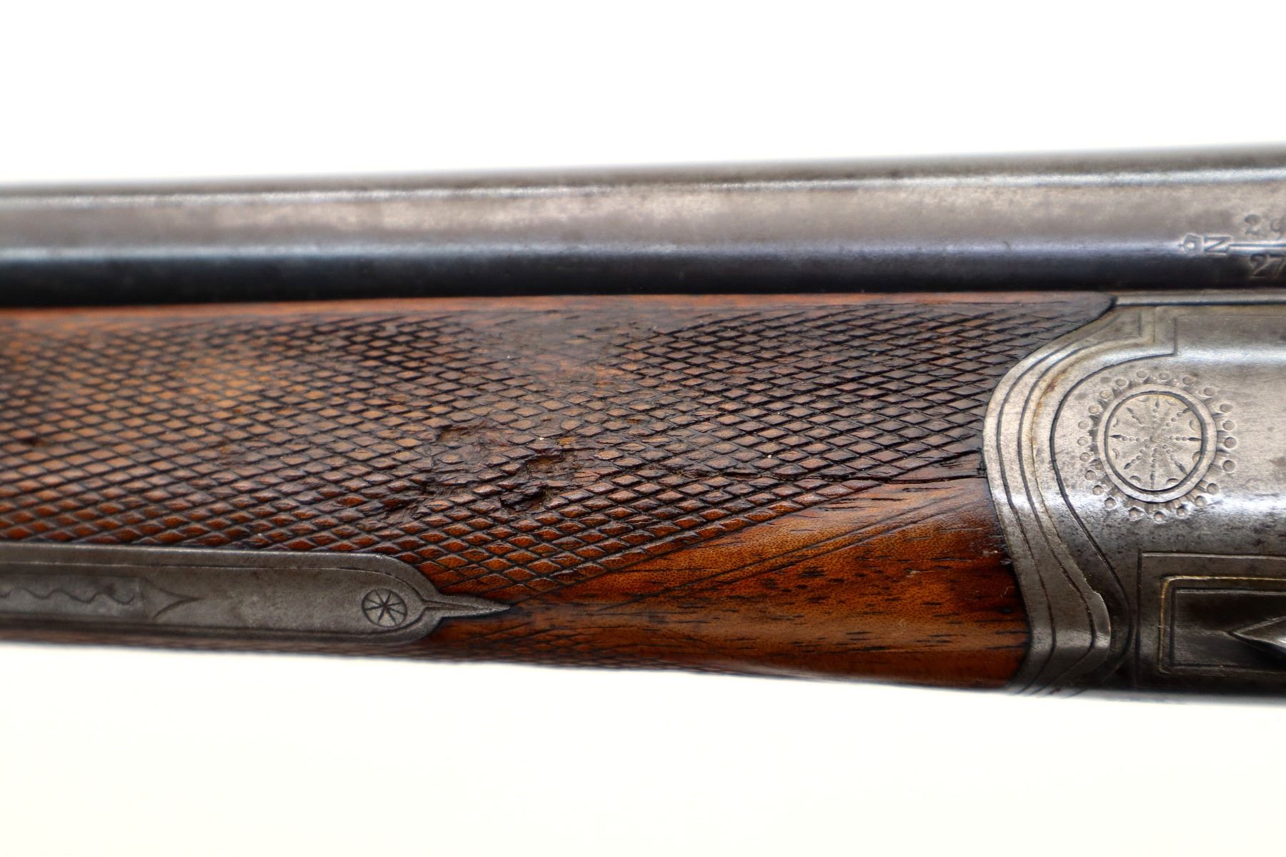 Wear: Metal finish shows some light rust speckles, scratches, handling marks and wear. Stocks show some marks, scratches and wear.