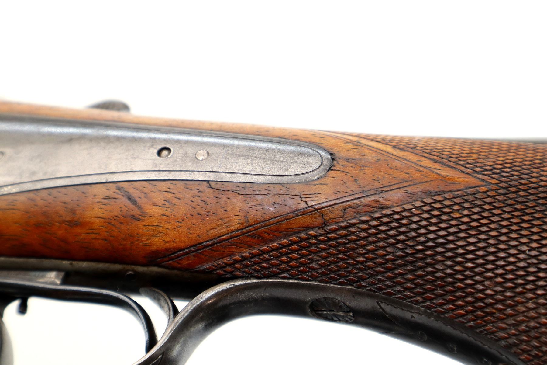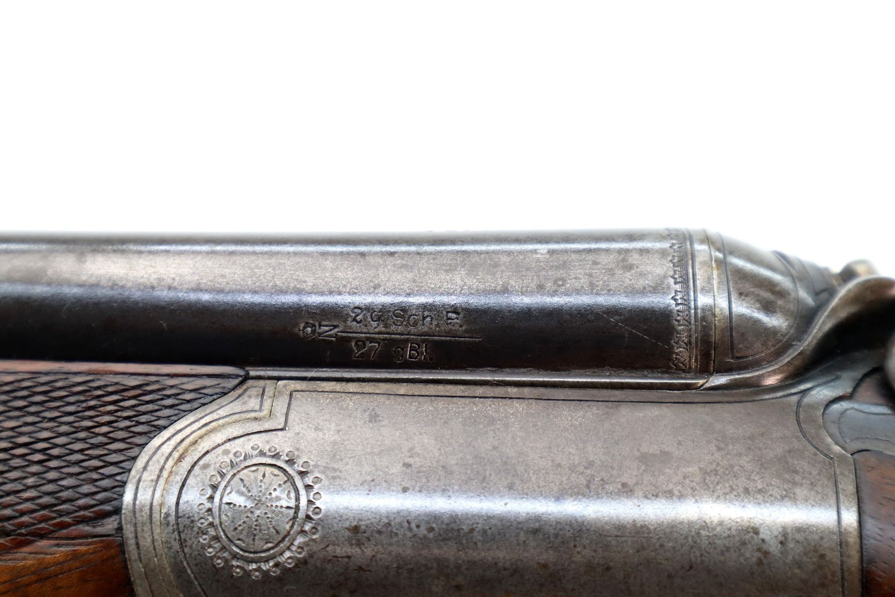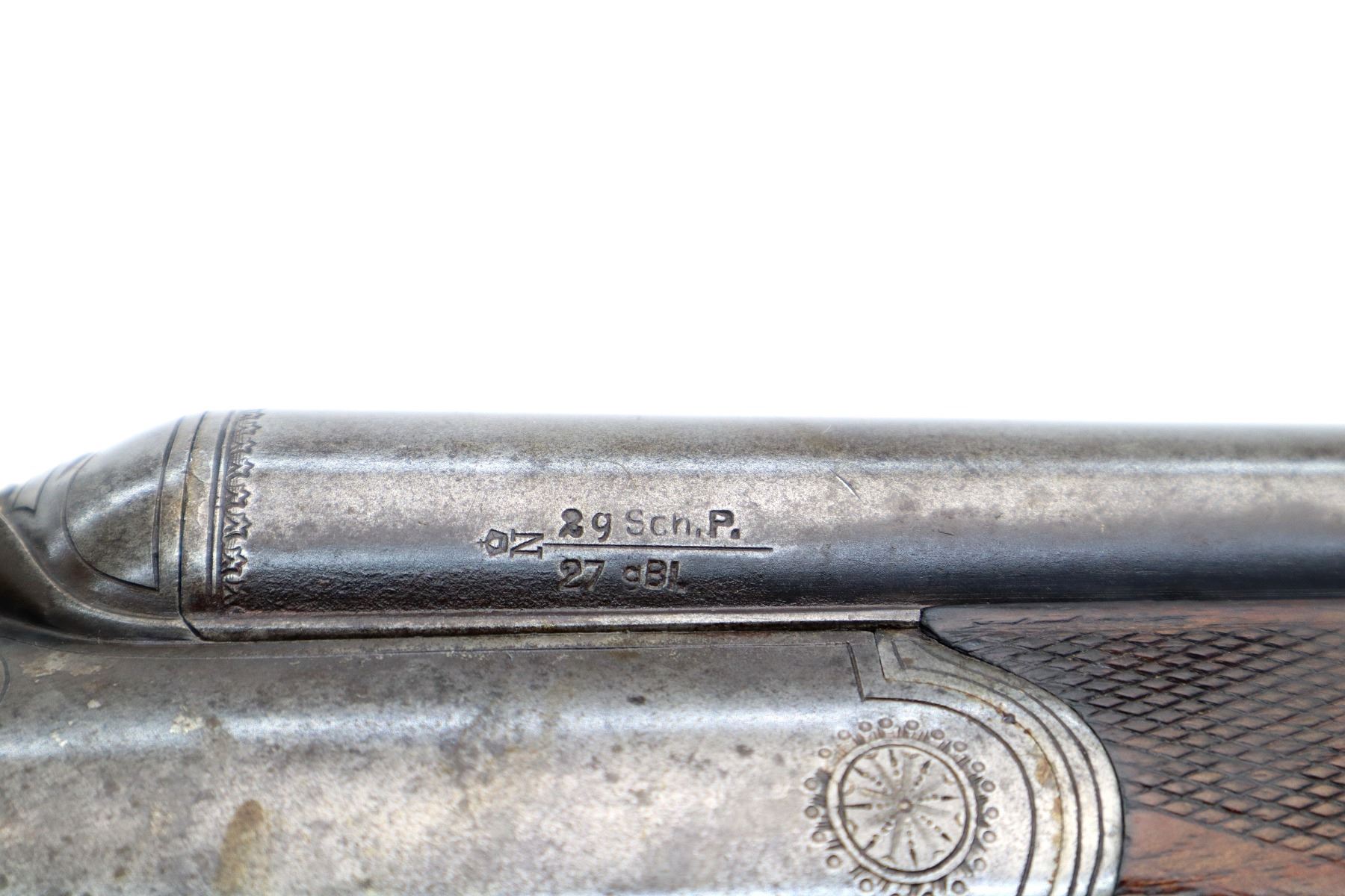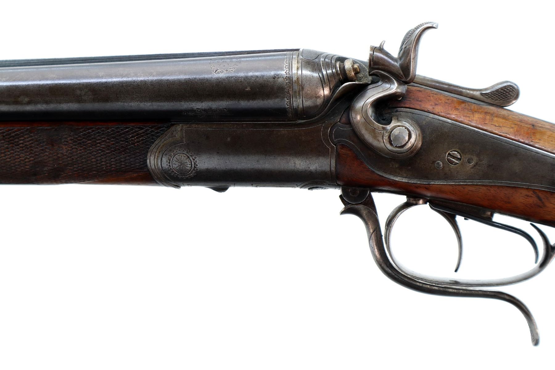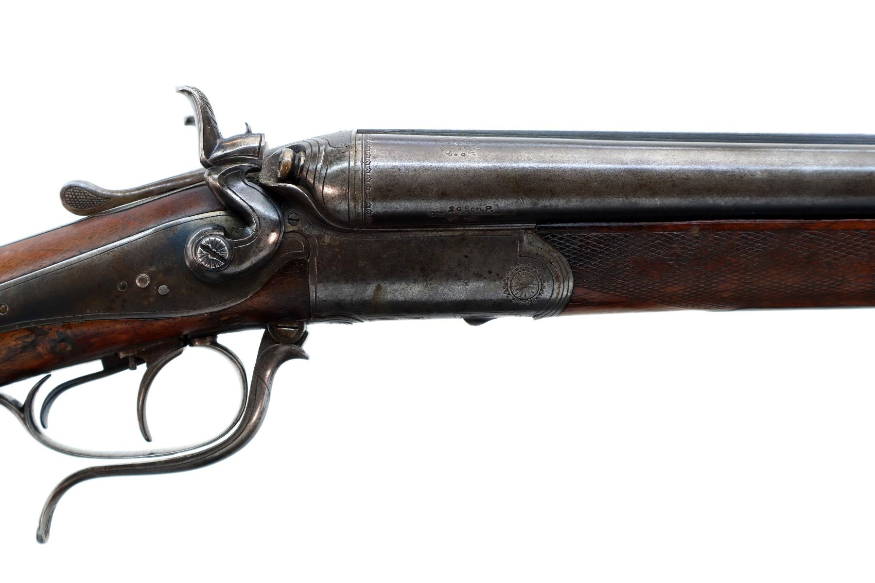 Main Description: Blade front sight, folding u notched rear sight, blued finish, solid rib, smooth back action locks with checkered spur hammers that function, left screw is damaged, rifle barrel selector on upper tang, checkered opening lever. Two piece wood stocks, checkered forearm which is chipped and cracked, checkered pistol grip, chipped cracked and repaired, European cheek rest, grooved horn butt plate, 13.75" LOP, stock cracked at heel and toe, grip cap, sling swivels.