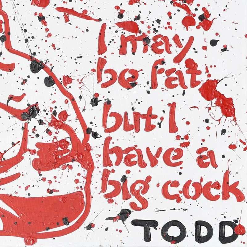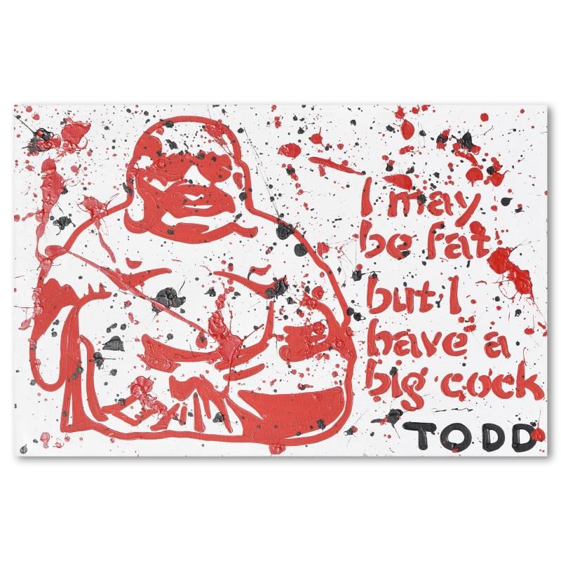 I Might Be Fat... by Goldman Original. Please see photos and description for all available information. We acquired this piece as part of a larger collection. We do not approve of its inappropriate content. "I Might Be Fat..." is an original acrylic painting on gallery wrapped canvas by Todd Goldman, hand signed by the artist. Includes Letter of Authenticity. Measures approx. 36" x 24" (image). Due to the way this piece was stored there may be minor wear or signs of age (such as wear on the corners) but the piece is in overall good condition.