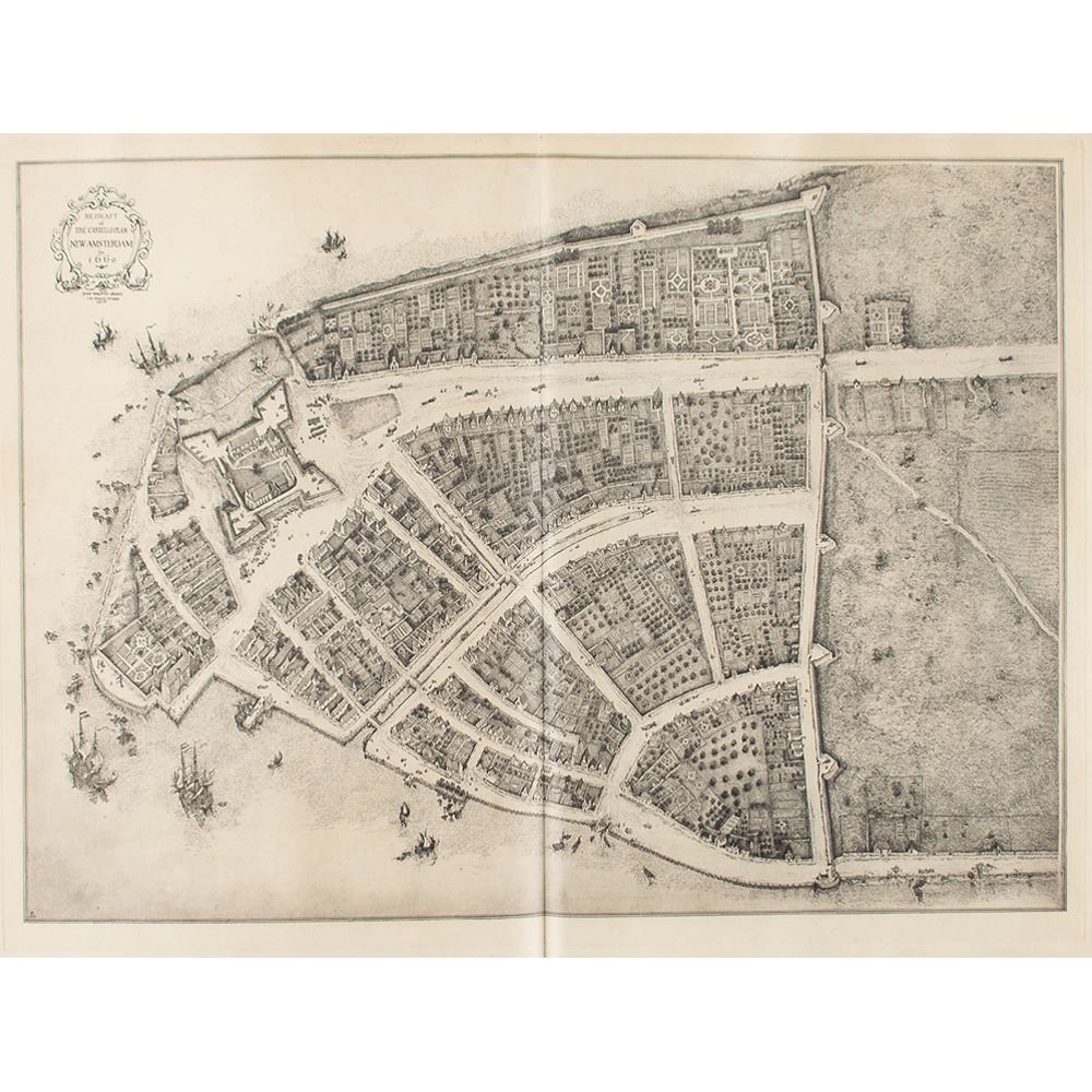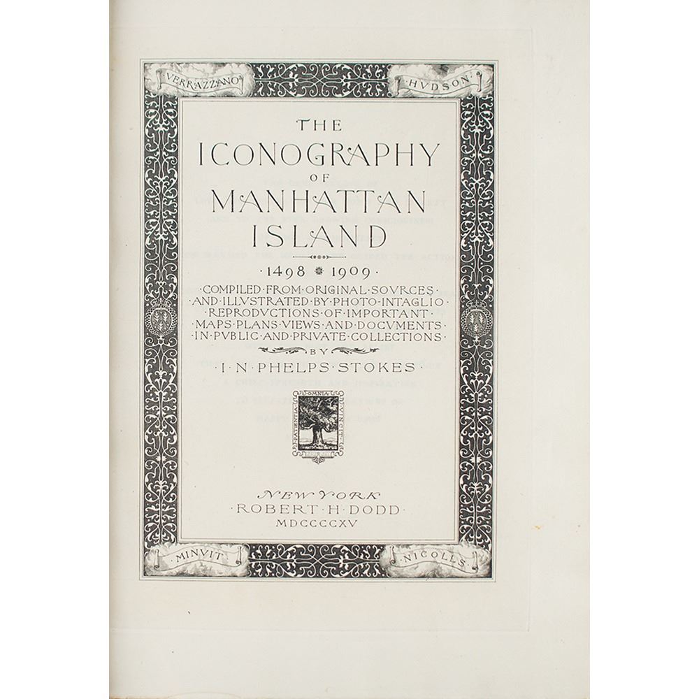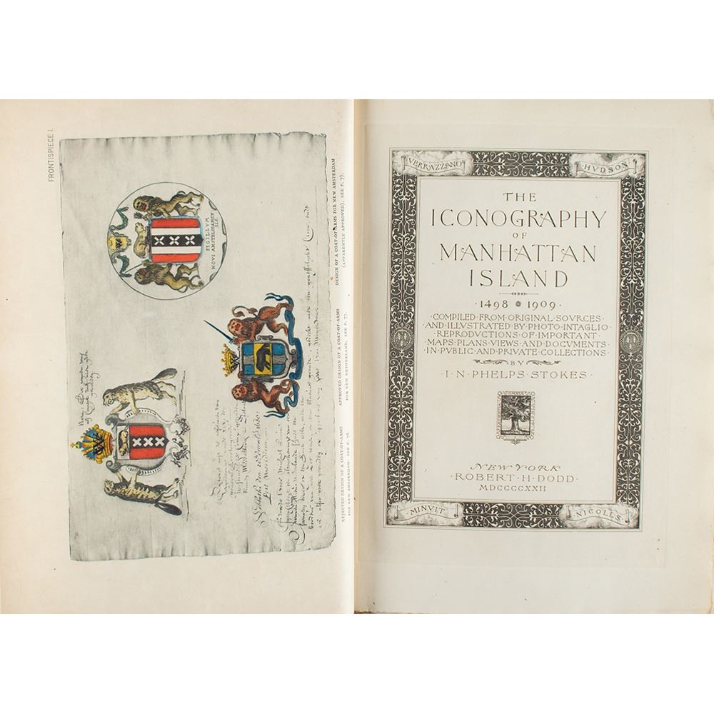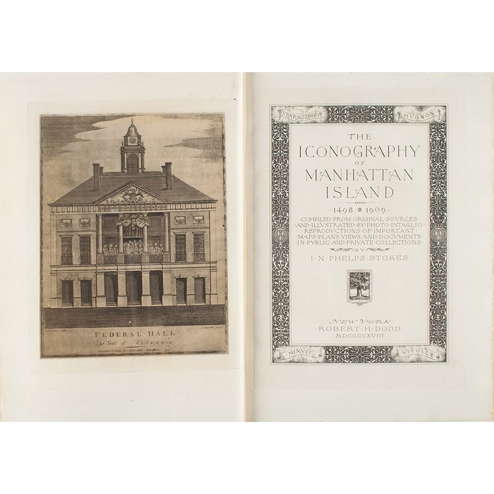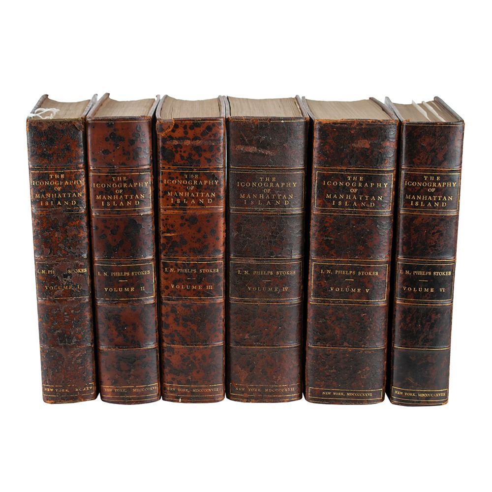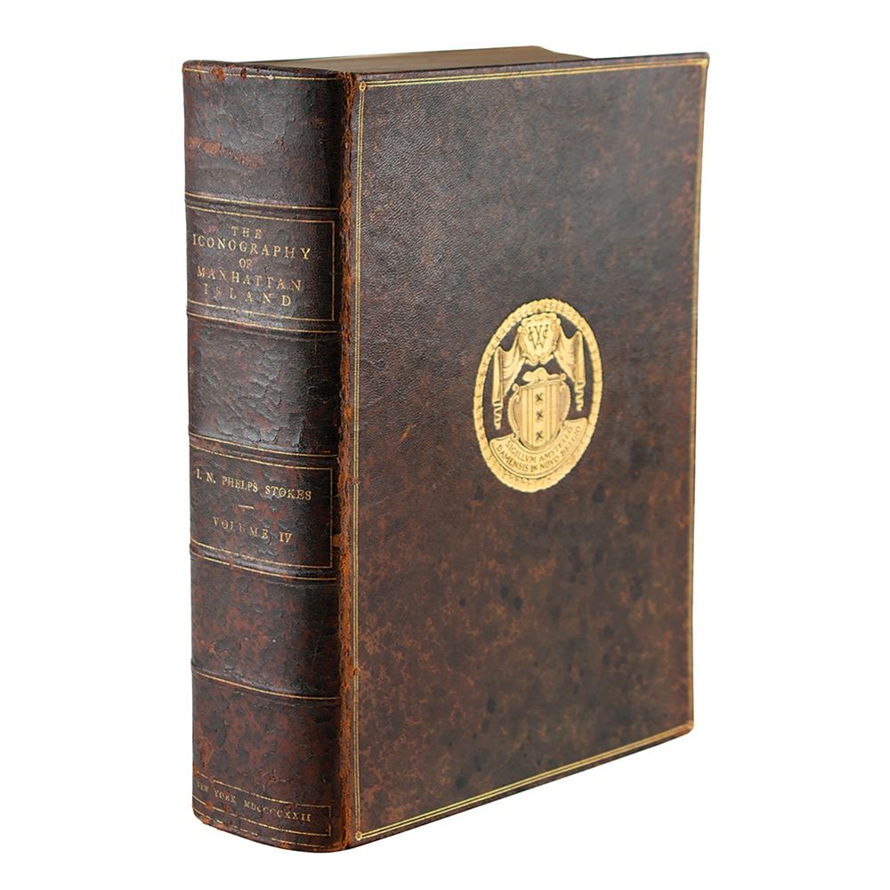 Rare, monumental six-volume study of the history of New York City: The Iconography of Manhattan Island, 1498–1909, Vols. I–VI, by Isaac Newton Phelps Stokes. First edition, limited issue of 360 copies on hand-made paper (plus an additional 42 on Japanese vellum). NY: Robert H. Dodd, 1915–1928. Hardcover bound in full brown mottled calf with gilt-stamped seals, 8.75 x 11.25, 5742 pages. Compiled from original sources and illustrated by photo-intaglio reproductions of important maps, plans, views, and documents from public and private collections, this expansive work records and documents key events of the city's chronology from the 16th to the early 20th centuries. Among other things, it shows the evolution of the Manhattan skyline up to the time of publication. Book condition: VG/None, with rubbing and flaking to spines, a large chip to the spine head of Vol. III, and the bookplate of Joel Davis Madden, Jr., affixed inside each volume. Accompanied by the original subscription announcement. Profusely illustrated with nearly 600 plates, The Iconography of Manhattan Island stands as the most elaborate and comprehensive history of New York City ever produced.