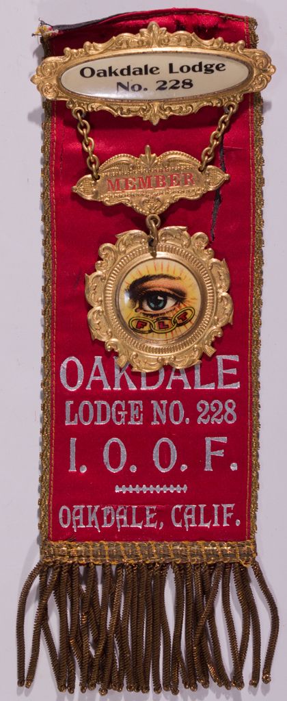 Lot of 11: A 34" long triangular felt "I. O. O. F." flag with an eye and three rings containing "F L T" on the right side of the flag. 2) An ornate pink and green velvet stole with raised-embroidered metal coils in a floral pattern. Gold coil fringe trim and two tassels on each end. 36" long excluding tassels and fringe. 3) A 20" long white and red velvet stole with pink and white floral embroidery and the following monograms: "D.D.G.M" and "DIST. NO. 50/ CALIF." The front is clasped together with a silver "The Sovereign Grand Order/ Of The Independent Order Of/ Odd Fellows/ 1854" medallion. 4) A 32" long, 22.5" wide pink satin and embroidered wall hanging with white flowers, gold rickrack, and a gold fringe. 5) A 3.5" long IOOF and PNG medallion on 14" of pink and green cord. 6) A 1.5" long beehive shaped medallion with birds, flowers, and stars on a 17" long green and white cord. Medallion reverse embossed with IOOF logo and "FLT". 7) A 3.25" x 6" black satin badge with a red, blue, green, white, and yellow pointed embroidered star and gold fringe. 8) A 3.5" diameter enameled metal hanger, likely used to hang banners, with the IOOF eye, skull and crossed bones, and "FLT" in the center. 9)A 4" long black metal cast hand with raised index finger above "IOOF" and three interlocked rings. 10) A silver metal badge inscribed "Ridgely Protective Association/ Worcester, Mass./ Pays/ Sick and/ Accident/ Benefits/ To I-O-O-F/ Only" on front and "If Injured or Unconscious/ This/ Number/ 114977/ Telegraphed/ to the/ R-P-A/ Will Identify Me" on reverse. Attached on a short chain to a black plastic "FLT Odd Fellows" token. 11) A 17" long gold, pink, and silver chain with two medallions: a shield shaped IOOF FLT medallion, and a round medallion of the same organization. -60668