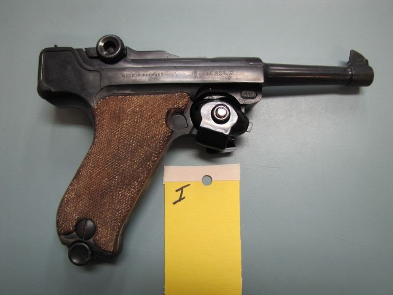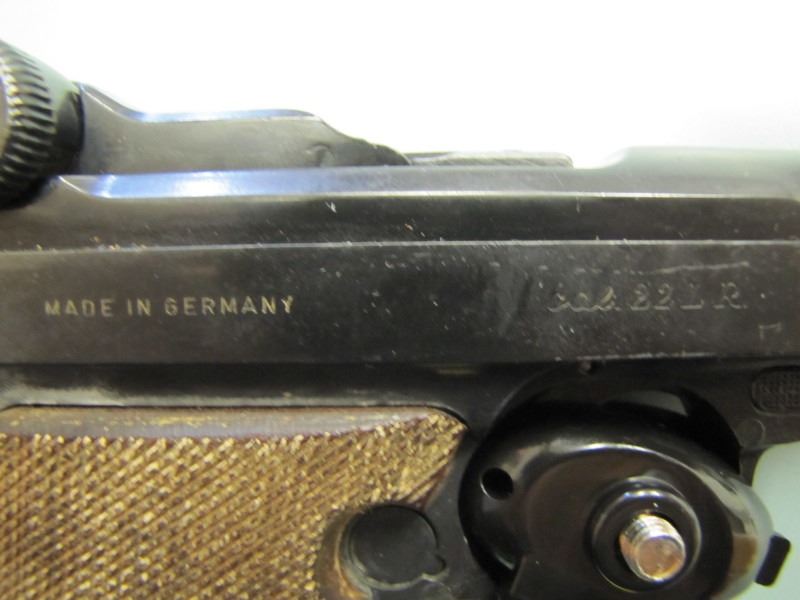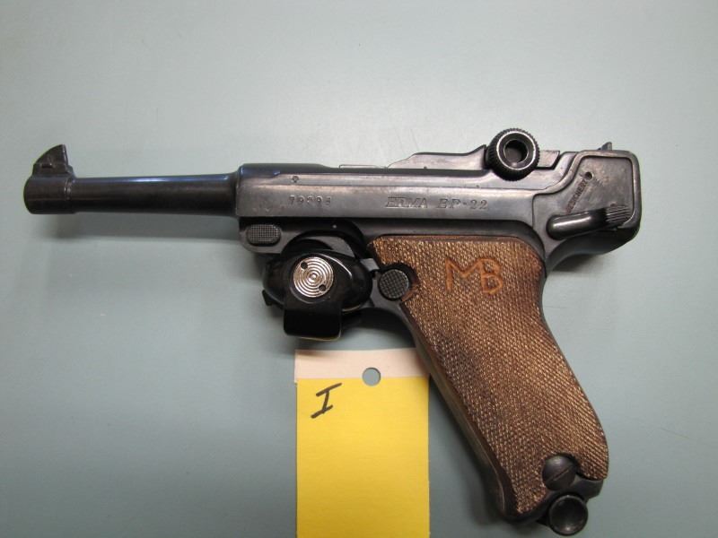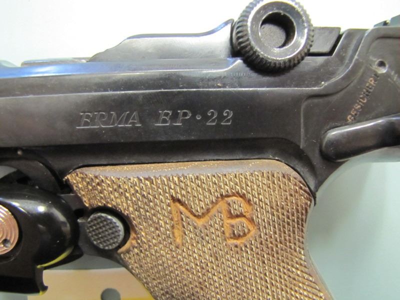 I... RESTRIC...Erma model EP 22 semi auto .22 cal pistol made in Germany. initials MB carved in grip.
