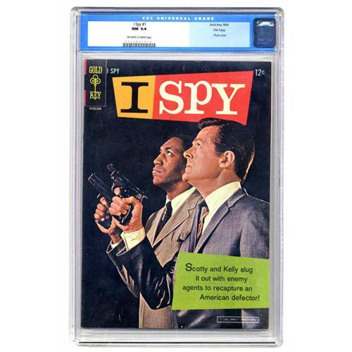 <B>I Spy #1 File Copy (Gold Key, 1966) CGC NM 9.4 Off-white to white pages.</B></I> This issue, with a photo cover featuring Robert Culp and Bill Cosby, is one of the most valuable of the Gold Key TV tie-in books. Overstreet 2005 NM- 9.2 value= $340. CGC census 11/05: 9 in 9.4, 1 higher.