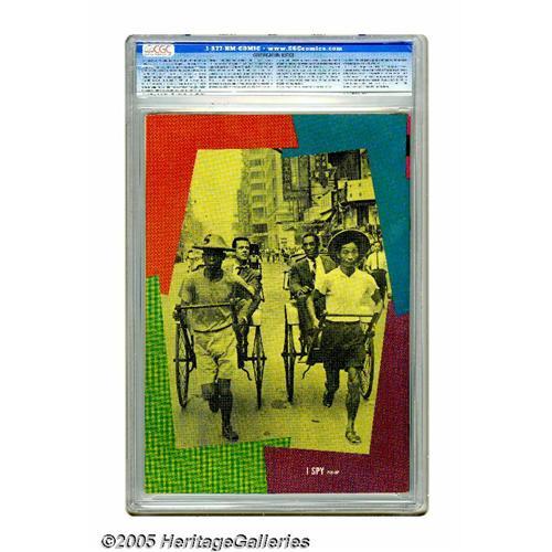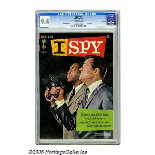 <B>I Spy #1 File Copy (Gold Key, 1966) CGC NM 9.4 Off-white pages.</B></I> This issue's black cover makes it a tough find in high grade, luckily we've got a copy from the files of Western Publishing. Bill Cosby and Robert Culp star on the photo cover -- why are they staring at the Gold Key logo, anyway? The issue's art is by Alden McWilliams. Overstreet 2005 NM- 9.2 value = $340. CGC census 7/05: 9 in 9.4, none higher. <I>From the Random House Archives.</B></I> <BR><BR><B>Important notice:</B> Heritage usually auctions material at the rate of 200-250 lots per hour. On some occasions eBay Live bid software or the Internet may not be able to keep up with the pace of the auction. We recommend placing a realistic absentee bid now as insurance to avoid disappointment. Occasionally the auctioneer may eliminate or reject an eBay Live bid, and the auctioneer may also reopen a lot after the close of the eBay live bidding (usually because we missed an audience bid), and may reject your bid even if it shows you as the winning bidder. By bidding via eBay Live, you agree that Heritage may award the lot to another bidder at its sole discretion under the circumstances described above or any other reasonable circumstances. Since eBay bids are not shown to us until we open the lot on the floor, we treat those bids just like floor bids. In most cases the floor responds before the eBay bid is presented to us, due to Internet lag time, so for consistency we have made it a policy that floor bids are always considered first over tie eBay live bids. Also please note that all Heritage lots purchased through eBay Live carry a 20% Buyer's Premium. Please make sure you read the Terms and Conditions before you bid. This lot is being auctioned in conjunction with a live floor auction by Heritage Galleries & Auctioneers. All final auction and invoice information will be supplied by Heritage Galleries & Auctioneers, and all other information should be considered preliminary. Lot:3183 <BR><BR><B>W