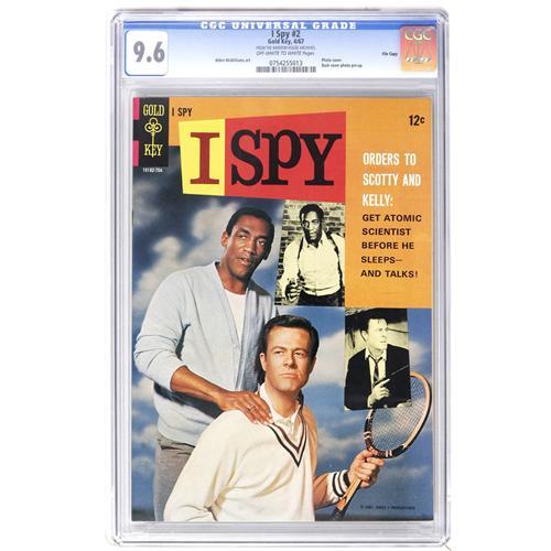 <B>I Spy #2 File Copy (Gold Key, 1967) CGC NM+ 9.6 Off-white to white pages.</B></I> Photo cover of Bill Cosby and Robert Culp. Back cover photo pin-up. Overstreet 2006 NM- 9.2 value = $200. CGC census 5/06: 8 in 9.6, none higher. <I>From the Random House Archives.</B></I> <BR><BR><B>Important notice:</B> Heritage usually auctions material at the rate of 200-250 lots per hour. On some occasions eBay Live bid software or the Internet may not be able to keep up with the pace of the auction. We recommend placing a realistic absentee bid now as insurance to avoid disappointment. Occasionally the auctioneer may eliminate or reject an eBay Live bid, and the auctioneer may also reopen a lot after the close of the eBay live bidding (usually because we missed an audience bid), and may reject your bid even if it shows you as the winning bidder. By bidding via eBay Live, you agree that Heritage may award the lot to another bidder at its sole discretion under the circumstances described above or any other reasonable circumstances. Since eBay bids are not shown to us until we open the lot on the floor, we treat those bids just like floor bids. In most cases the floor responds before the eBay bid is presented to us, due to Internet lag time, so for consistency we have made it a policy that floor bids are always considered first over tie eBay live bids. Also please note that all Heritage lots purchased through eBay Live carry a 22.5% Buyer's Premium. Please make sure you read the Terms and Conditions before you bid. This lot is being auctioned in conjunction with a live floor auction by Heritage Auction Galleries. All final auction and invoice information will be supplied by Heritage Auction Galleries, and all other information should be considered preliminary. Lot:41001 <BR><BR><B>Winning Notification and Billing:</B> After the FINAL session in this auction is complete, Heritage will send e-mail and snail mail invoices. This process normally takes several days. All final auction and invoice information will be supplied by Heritage Auction Galleries, and all other information should be considered preliminary. <BR><BR>This auction will be conducted on a live auction floor and over the Internet through eBay Live. If you choose to place an absentee bid, please take a moment to <font color='#0000ff'><u><a href='http://pages.ebay.com/liveauctions/help/before/laabsentee.html'>learn how eBay Live absentee bidding works</a></u></font><font color='#000000'>