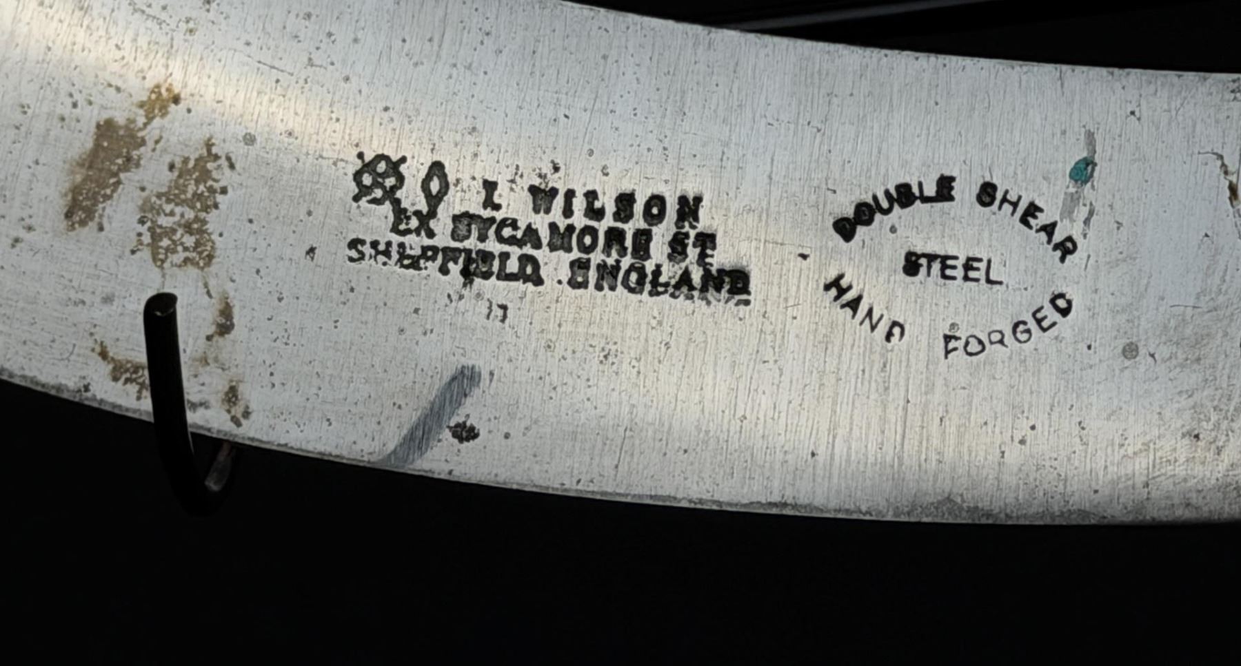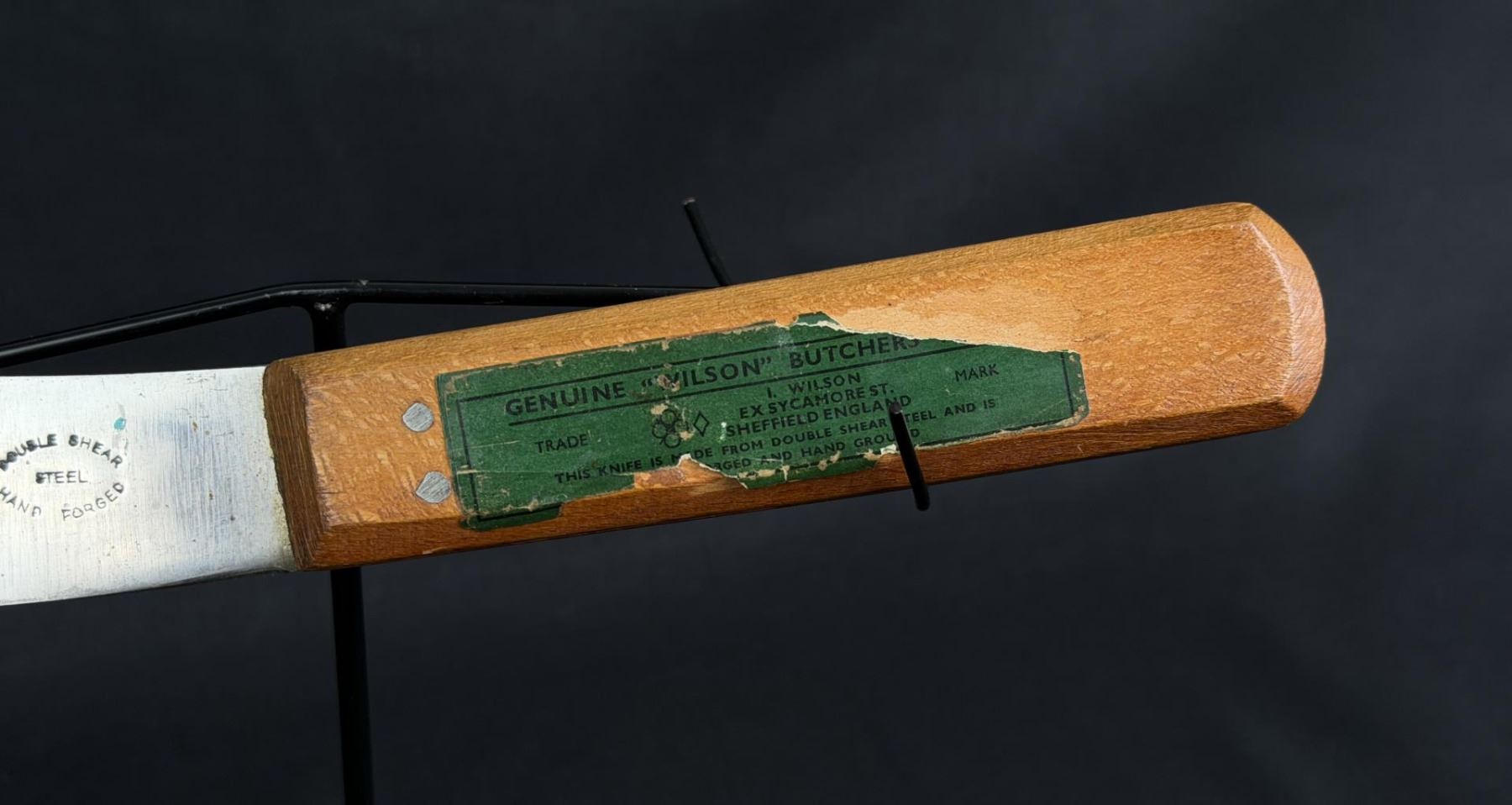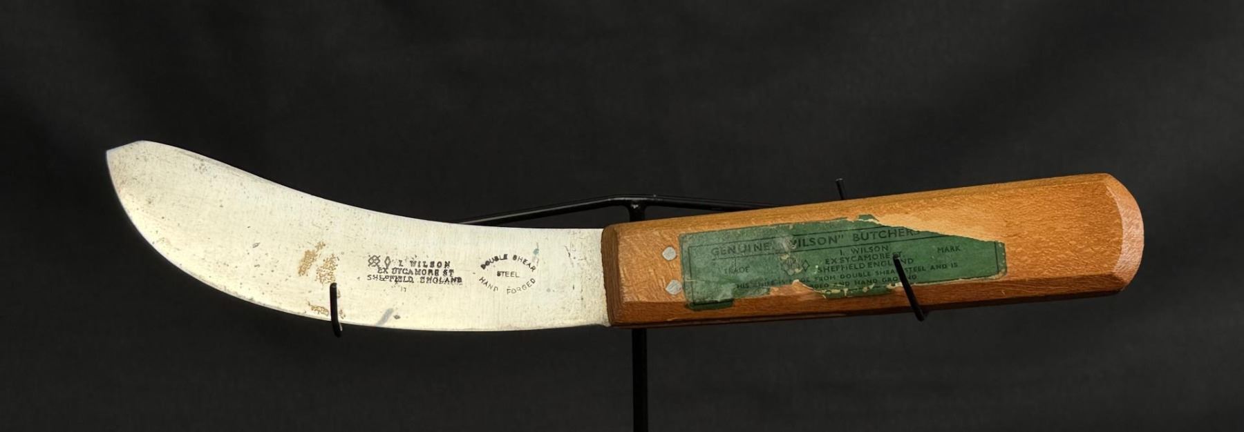 Skinning Butcher knife, with some original label remaining. From Sycamore Street, Sheffield England. From the Esteemed Norm Greenberg Collection. 10 1/4" long.
