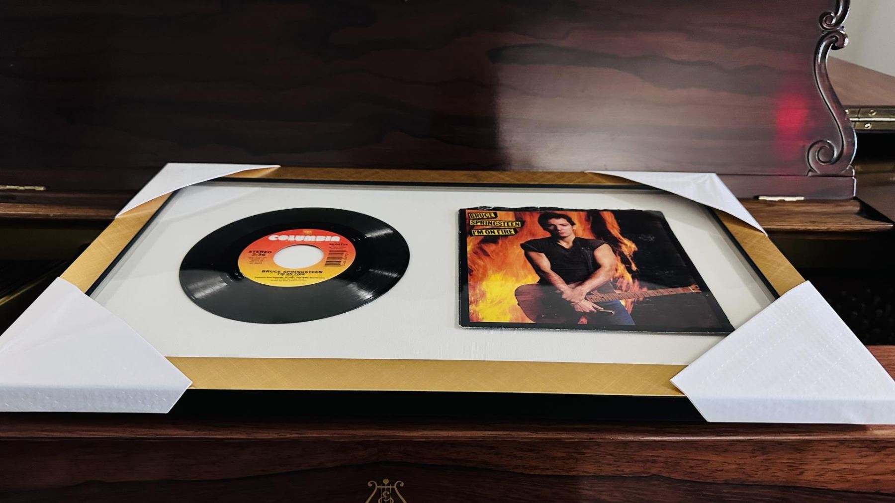 A Collector's Item, an original Issue 45 rpm record of Bruce Springstein's mega-hit "I'm On Fire" & the original record jacket. The frame is 12.5x21" mounted on linen.