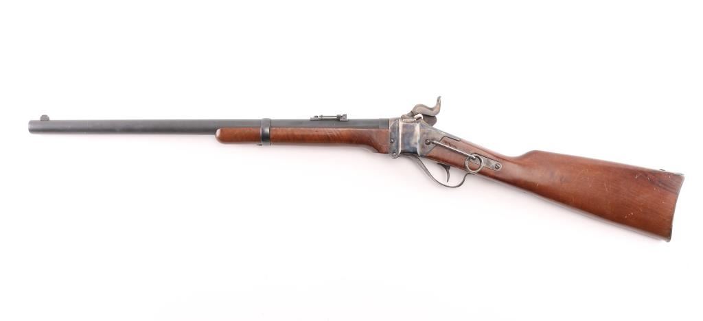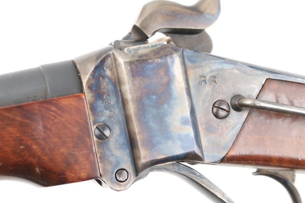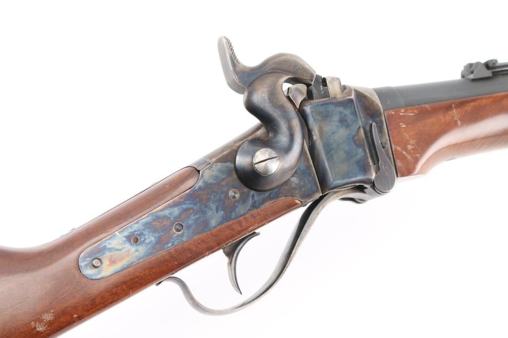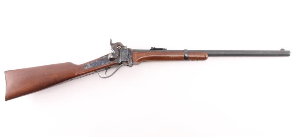 Italian reproduction of a Sharps straight breech cartridge carbine. Features blued & case colored finish, smooth wood forend, straight wristed smooth wood shoulder stock with smooth metal buttplate, 22" round barrel, blade front & folding ladder rear sights, sling bar with ring. Bore is excellent. Retains 90% matte blue on barrel, with scrapes and scratches. Case colors are bright & fiery, very good or better, showing gold colors and dark blues, with scratches and other handling marks. Hammer screw is mostly bare metal. Wood is very good, scratches and dented. Condition is NRA Very Good+ *** Modern Firearm ***