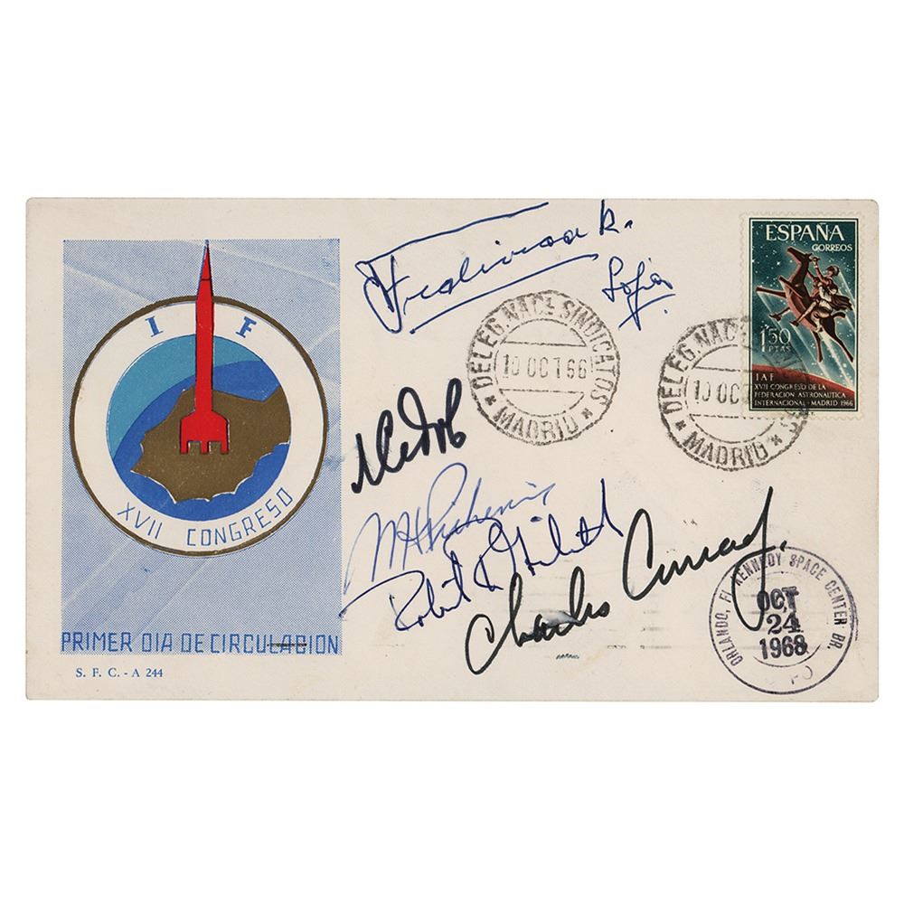 Commemorative cover with a cachet honoring the International Astronautical Congress held in Madrid, Spain, in October 1966, signed in ink by Frederica of Hanover, the former Queen of Greece; her daughter Sofia, the later Queen of Spain; Leonid Sedov, chairman of the USSR Space Exploration program; William Hayward Pickering, the father of Explorer 1; NASA MSC director Robert Pickering; and Apollo 12 moonwalker Charles Conrad. In fine condition. Consignor notes that the cover originates from the collection of Josip Kotnik, a Croatian electrical engineer and astronautics expert who published the book €Îovjek u svemiru [Man in Space] in 1968. The cover bears 1968 Kennedy Space Center postmarks on the front and back, commemorating Kotnik's visit to the facility.