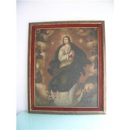 BOLIVIAN SCHOOL. RELIGIOUS PAINTING DEPICTING HOLLY MOTHER OF CONCEPTION FLOATING ABOVE THE MOON, SURROUNDED BY FLYING ANGELS AND RELIGIOUS ICONS. 1700' LAST RESTORATION DATES FROM 1960' BY BRAZILIAN FAMOUS RESTORER AND ARTIST EDSON MOTTA.
