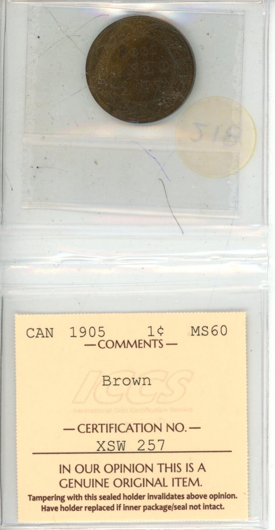 ICCS - 1905 1 Cent MS60