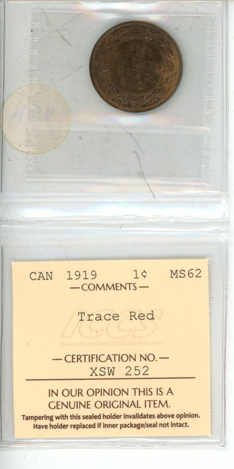ICCS 1919 Canadian One Cent - MS62 - Trace Red.