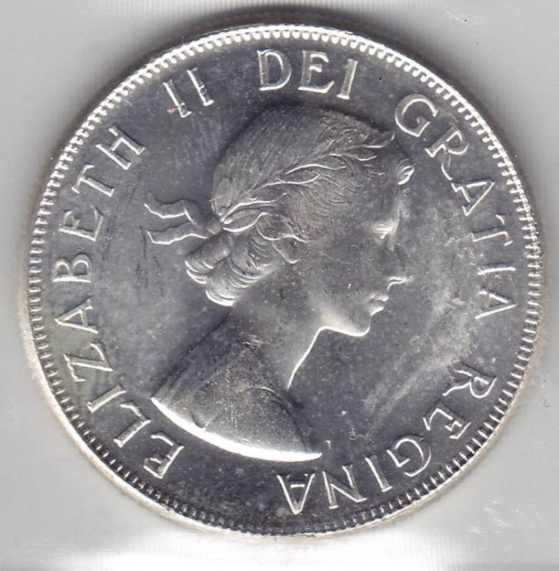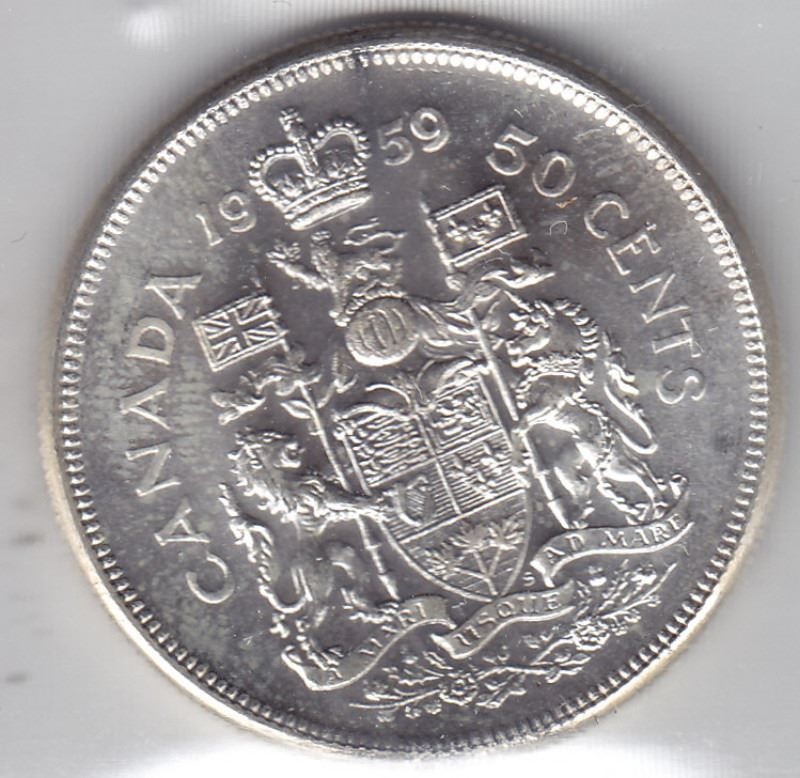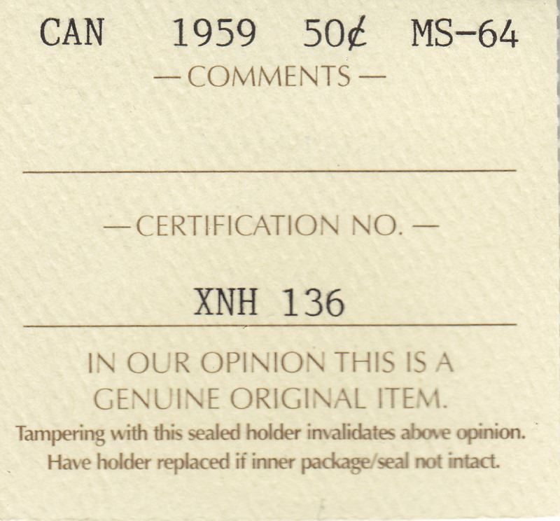 ICCS 1959 Canadian Silver Half Dollar Coin; Graded MS-64