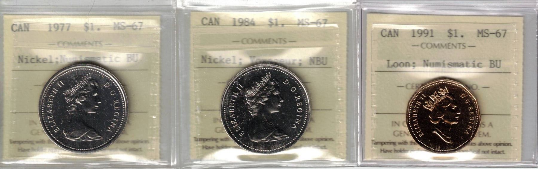 ICCS 1977 Nickel-1984 Nickel-1991 $1 MS67, 4pcs All NBU