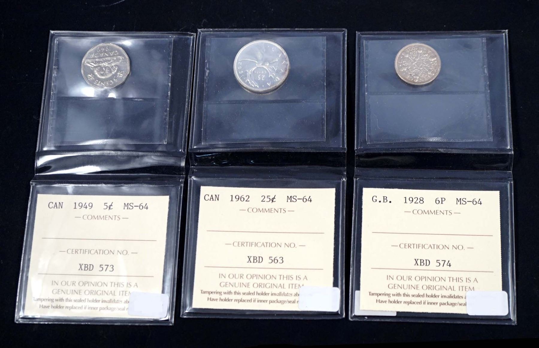 England 1928 Six Pence Silver XBD 574 Original surfaces. 1x 1949 Canada 5 Cents XBD 573 and 1x 1962 25 cents