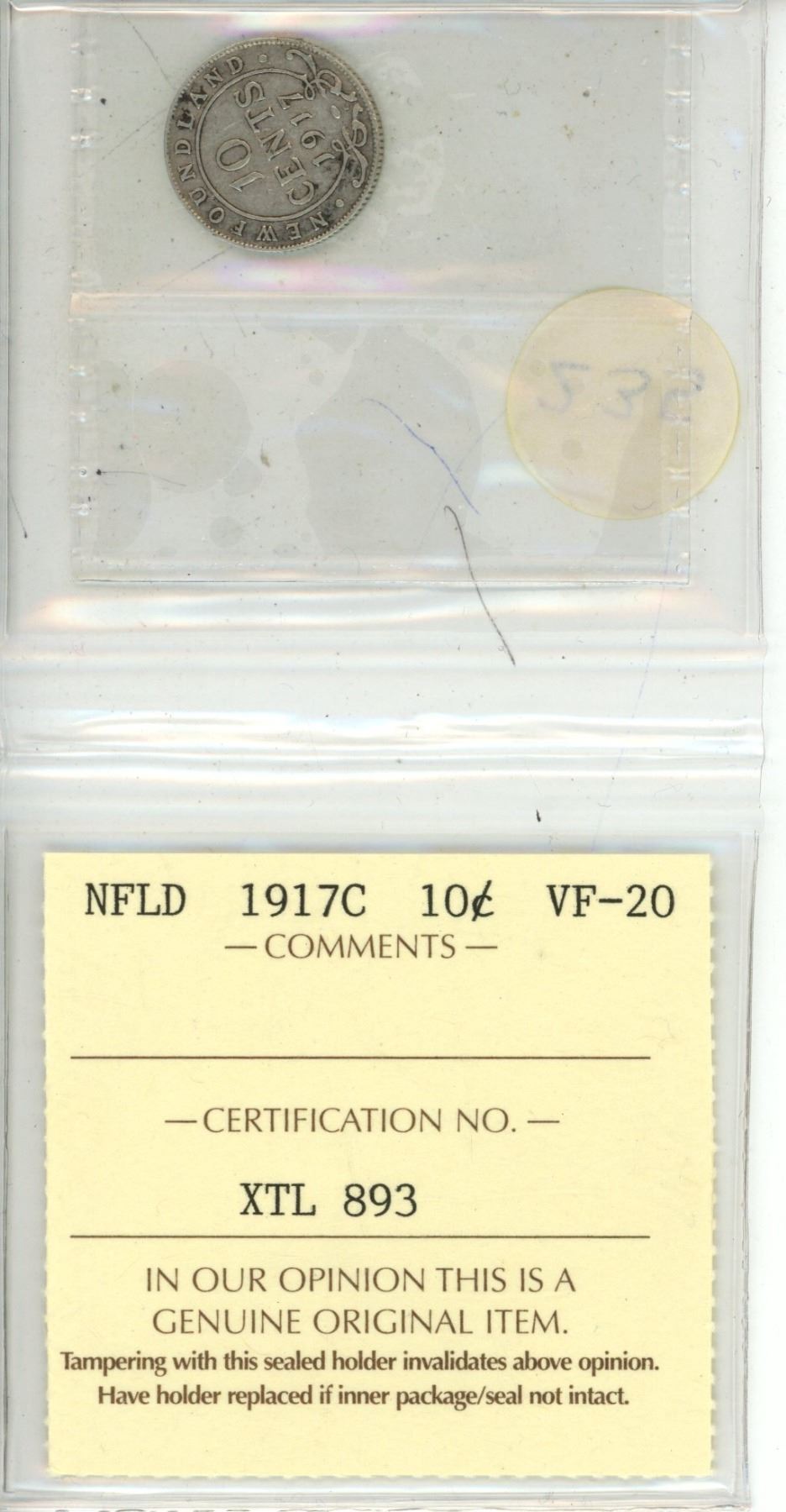 ICCS - NFLD 1917C 10 Cent VF-20