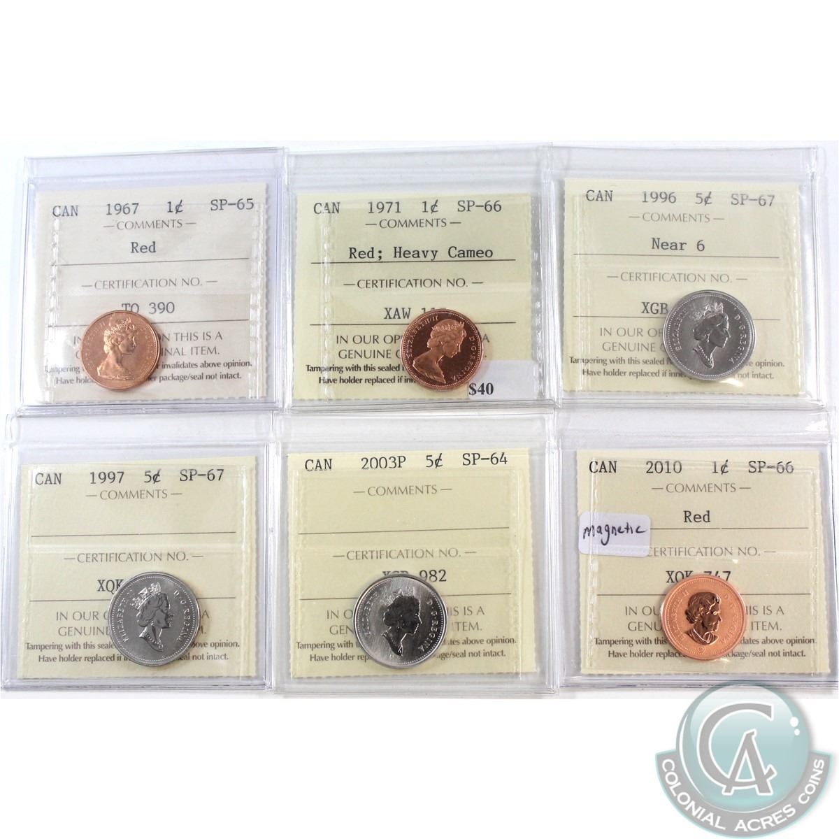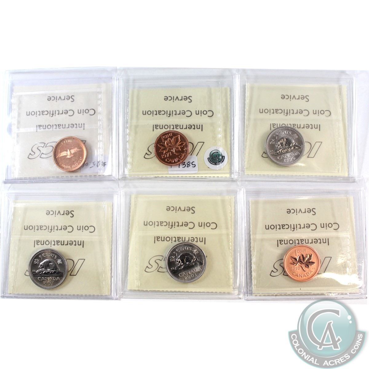 ICCS Specimen Lot; 1967 1ct SP-65, 1971 1ct SP-66 Heavy Cameo, 2010 1ct SP-66 Magnetic, 1996 5ct Near 6 SP-67, 1997 5ct SP-67, 2003P 5ct SP-64. 6pcs