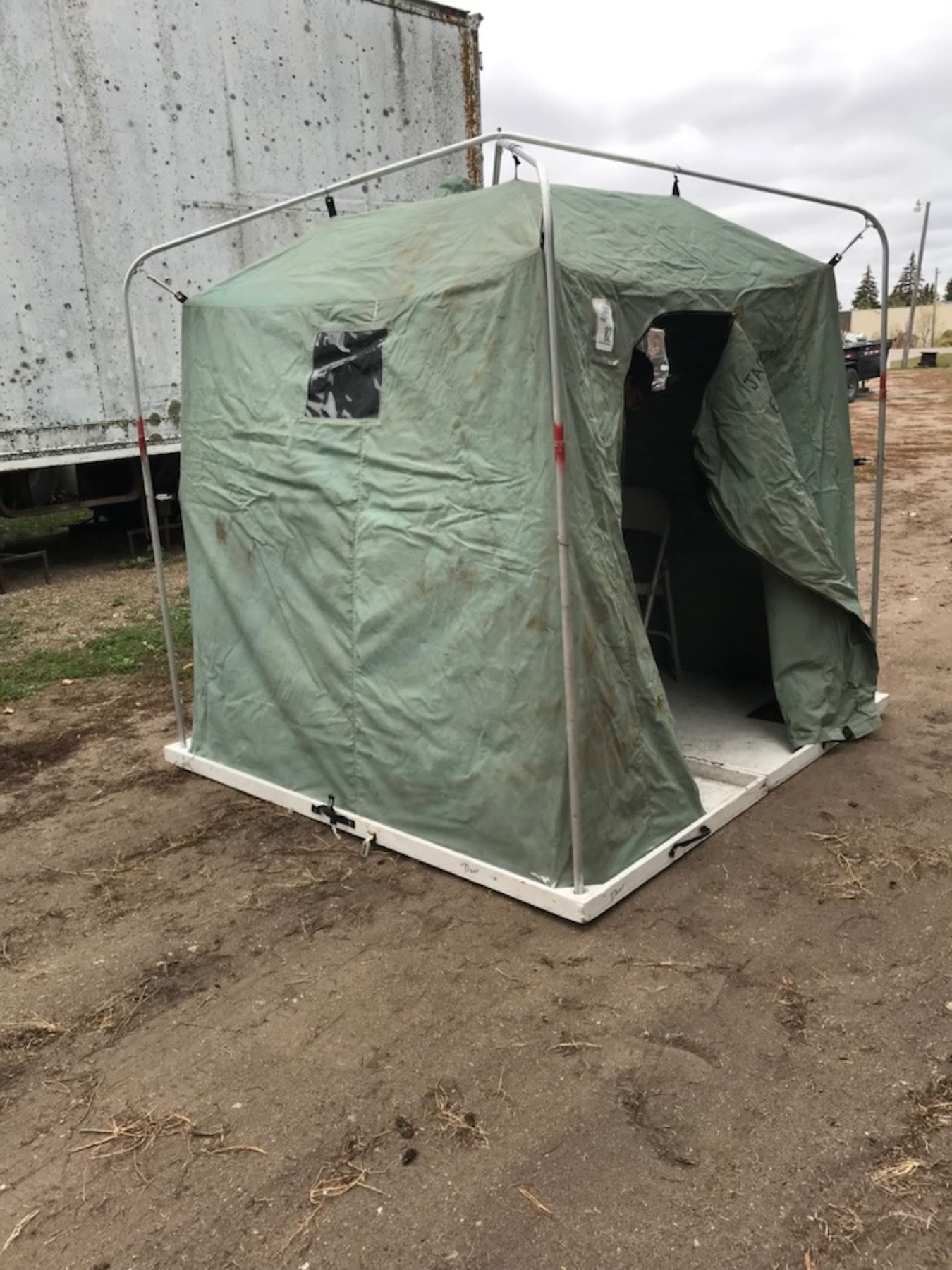ICE FISHING HOUSE; 6 FT X 6 FT BASE; EXTERNAL FRAME; HARD FLOOR; FOUR HOLES; TWO CHAIRS; EVERYTHING FOLDS AND STORES INSIDE THE FLOOR; KEVIN NOT INCLUDED, BUT IF YOU TAKE HIM FISHING HE WILL BAIT YOUR HOOK;