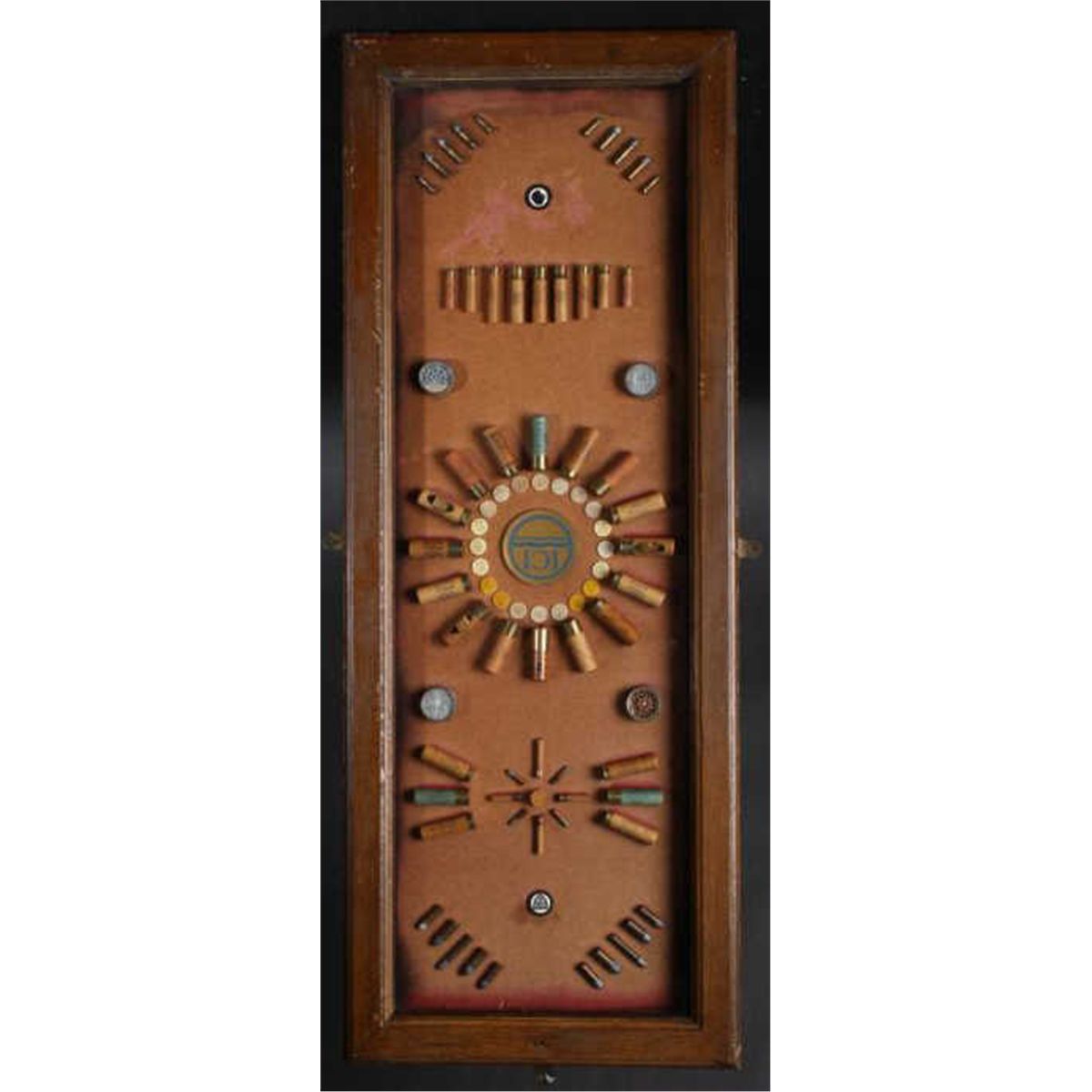 ICI-Eley cartridge display board in old oak frame showing shells dating back to rimfires, many cutaway shotgun shells and displays. Approx. 46” in height by 17-1/2” in width (outside dimensions). An older Eley boardthat was upgraded when ICI merged. Good condition, some slight damage to the frame, some slight replacements and upgrading. From the Robert Petersen Collection. Est: $750- $1,500