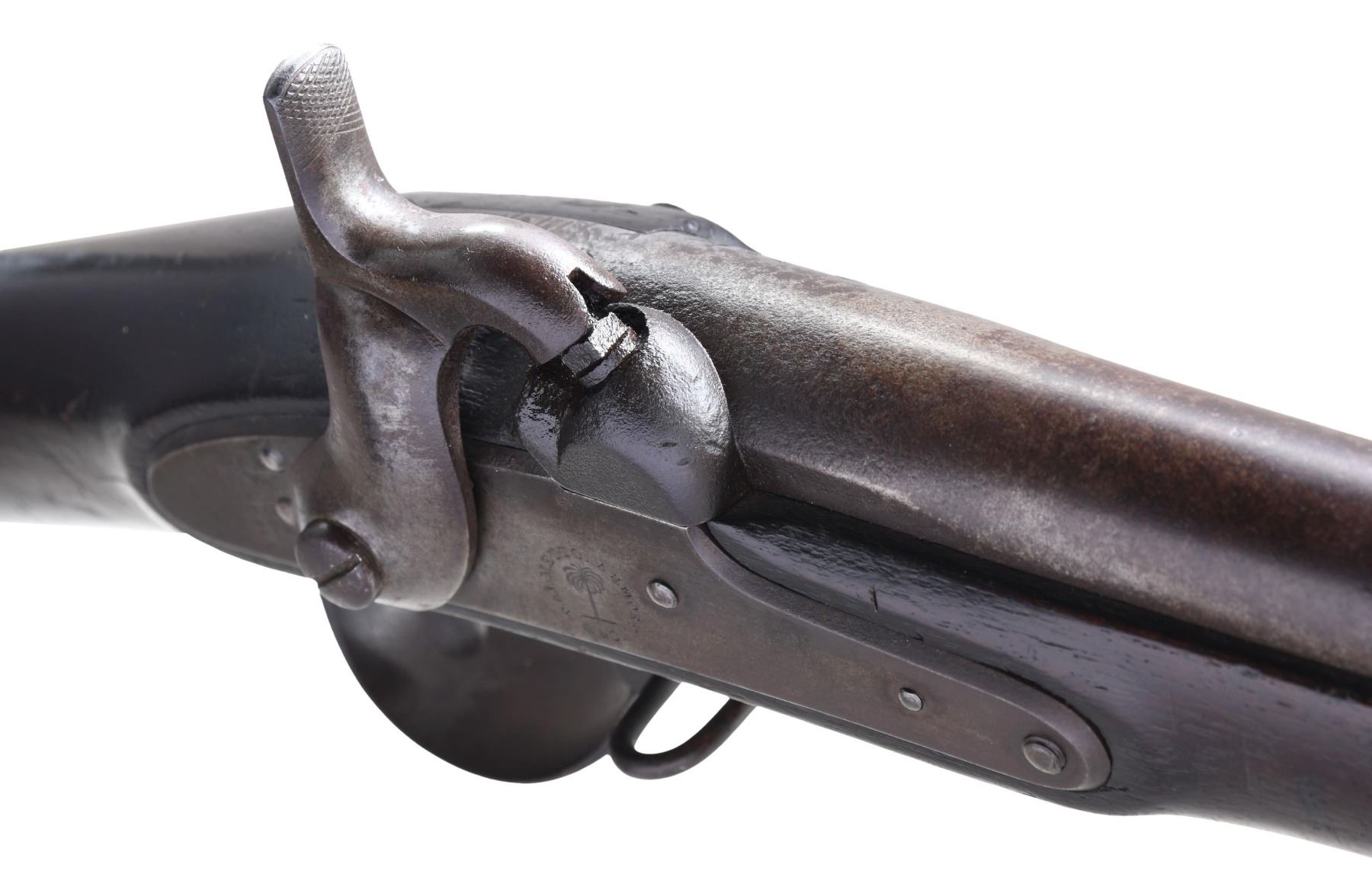 CAROLINA PALMETTO MUSKET, MARKED "CAPTURED at HILTON HEAD / SOUTH CAROLINA / Nov. 7th 1861". Please note as of 4/29/25 this item description has been updated. Please revisit this description and contact us with any questions. Confederate General Thomas F. Drayton was in charge of the important & strategic Port Royal district of South Carolina. He constructed earthen fortifications including Fort Walker where this musket was captured and carved. Drayton, a West Point graduate, owned large plantation with many slaves who he used to build the fortifications that would be overrun by US naval forces November 7, 1861. Among the Union assault was his brother Percival, a life-long US naval officer on USS Susquehanna. The South Carolina troops under Drayton were armed with Palmetto muskets as noted by at least 3 identified survivors taken as souvenirs by victorious Union troops at the November 7 battle. This standard production 1842 musket was made under State of South Carolina contract by William Glaze in 1853, muskets remained in SC armories till issued to troops at beginning of Civil War. This musket was once part of Norm Flayderman’s incredible CW collection and pictured in his 2004 book "The Bowie Knife". William Glaze assembled Model 1842 muskets for this SC contract. In this case, a standard 42" surplus US Springfield barrel with Springfield: "V" over "P" over "Federal Eagle" proof marks present on the breech of this musket was used. Then Glaze and Flagg added the "W.G&CO" marking to the left barrel flat and overstruck the Federal Eagle with the Palmetto Tree Proof Mark mostly obsuring the Eagle but if you look closely you can see the Federal Eagle's Beak protruding out of the Palmetto Tree's Canopy. An "S.C." was also struck on the barrel extension. Lock is among the finest condition examples marked "Palmetto Armory, S*C" around a Palmetto tree forward of lock and rear of lock is well struck "Columbia/S.C. 1852". The buttplate has "SC" surcharge. Mounted with brass barrel bands, unique to Palmetto. Professionally carved on either side of butt stock "CAPTURED at Hilton Head / South Carolina / Nov. 7th 1861" and "J. Butterworth / U.S. Ship Susquehanna". Butterworth was sailor on Susquehanna who was part of task force taking Port Royal & Hilton Head. This is the finest example of a Palmetto musket extant with phenomenal Civil War history.
