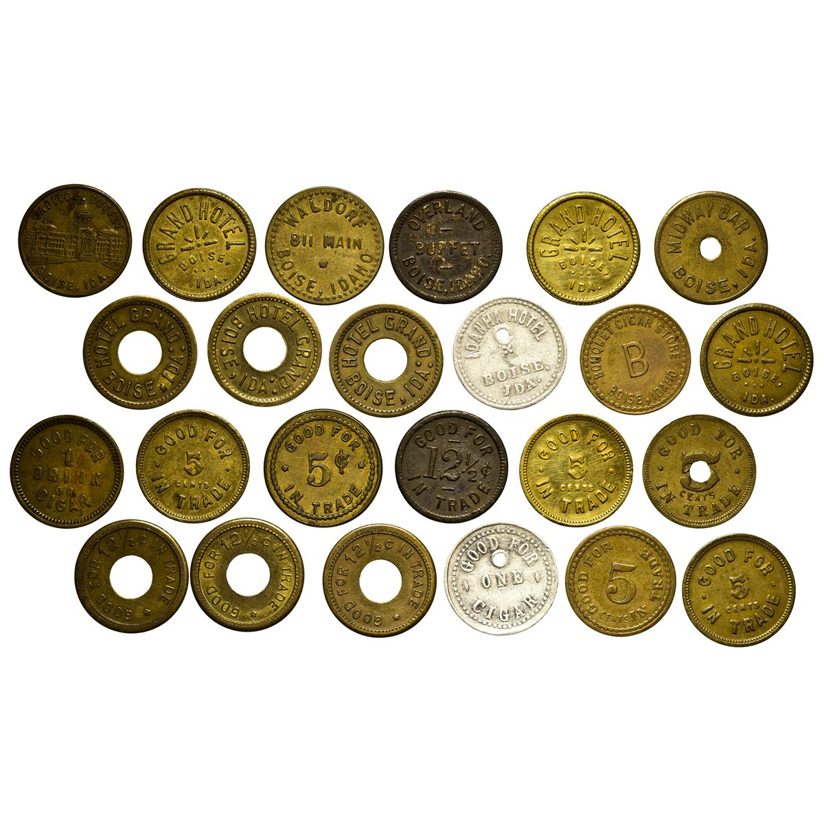 Lot of 12: 1-3) Hotel grand. GF5cIT. F-VF. 4-6) Hotel Grand. GF12 1/2cIT. Holed. F-VF. 7) Capital Buffet. GF1 drink or cigar. Pictorial. Fine. 8) Overland Buffet. GF12 1/2cIT. Good. 9) Bouquet Cigar Store. GF5cIT. VF. 10) Idanha Hotel. GF1 cigar. Holed. Fine. 11) Midway Bar. GF5cIT. Holed. VF. 12) Waldorf 811 Main. GF5cIT. Fine.