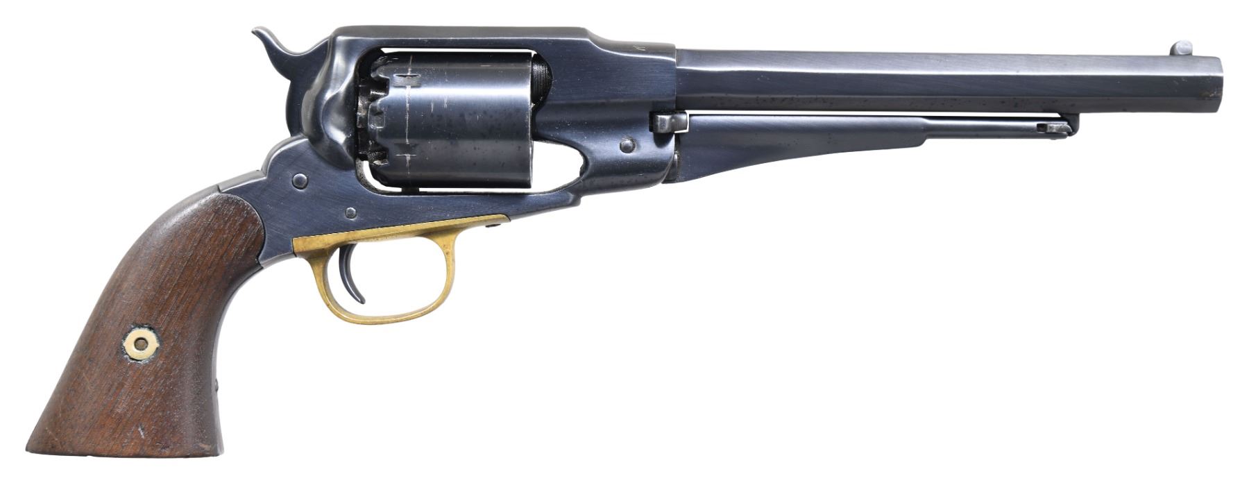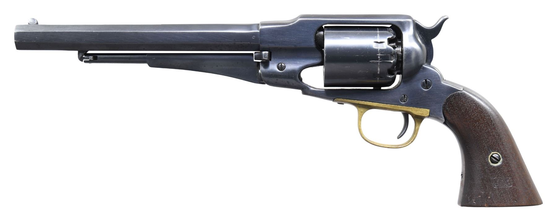 Cal. 44. S# 50273. Bbl. 8" octagon. Round blade front sight. Fixed rear sight. Reblued finish. Brass trigger guard. Two-piece walnut grips with visible inspector's cartouche. UNATTACHED ACCESSORIES: Civil War Weapons Search printout giving the following information for Remington NM revolver S# 50273: "CIVIL WAR REGIMENT 19TH NY VOL CAV (1864)." Also includes info about 19th Cavalry Regt. CONDITION: refinished grips show a couple light chips, some dents & handling marks. Metal retains 90% reblue with a drag-line on cyl., some fading on grip straps, light oxidation & fading. Action is very sluggish when hand cycled. Bore shows scattered light pitting & frosting but good rifling. PROVENANCE: From the Lifelong Collection of George Staden S&W Member #3451. (01-26616/MJC). ANTIQUE. $700-1000.