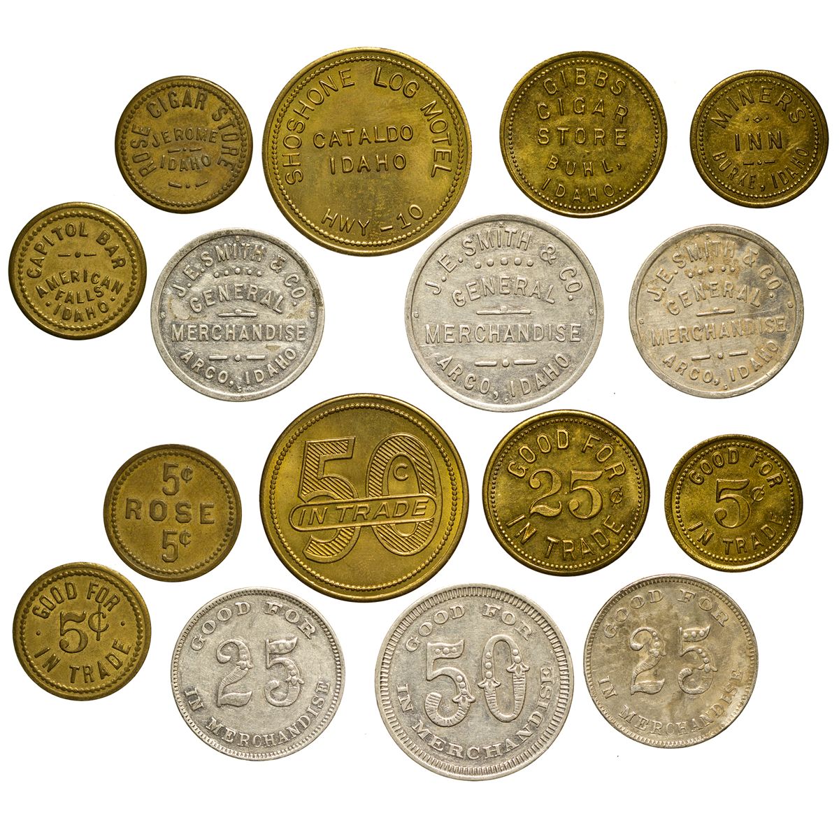 Lot of 8. 1) American Falls, Capital Bar. GF5cIT. XF. 2) Arco, JE Smith. GF25cIM. Fine. 3) Arco, JE Smith. GF25cIM. Fine. 4) Arco, JE Smith. GF50cIM. Fine. 5) Buhl, Gibbs Cigar. GF25cIT. Unc. 6) Burke, Miners Inn. GF5cIT. Unc. 7) Cataldo, Shoshone Log Motel. 50c. Unc.8) Jerome, Rose Cigar. 5c. Fine.