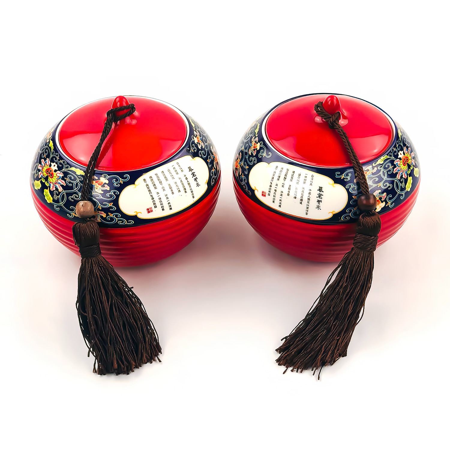 #8365 - 2 TEA STORAGE CADDYS WITH TASSELS. THEY MEASURE: 4.5 (11.5 CM) HIGH BY 5” (13 CM) MIDDLE DIAMETER