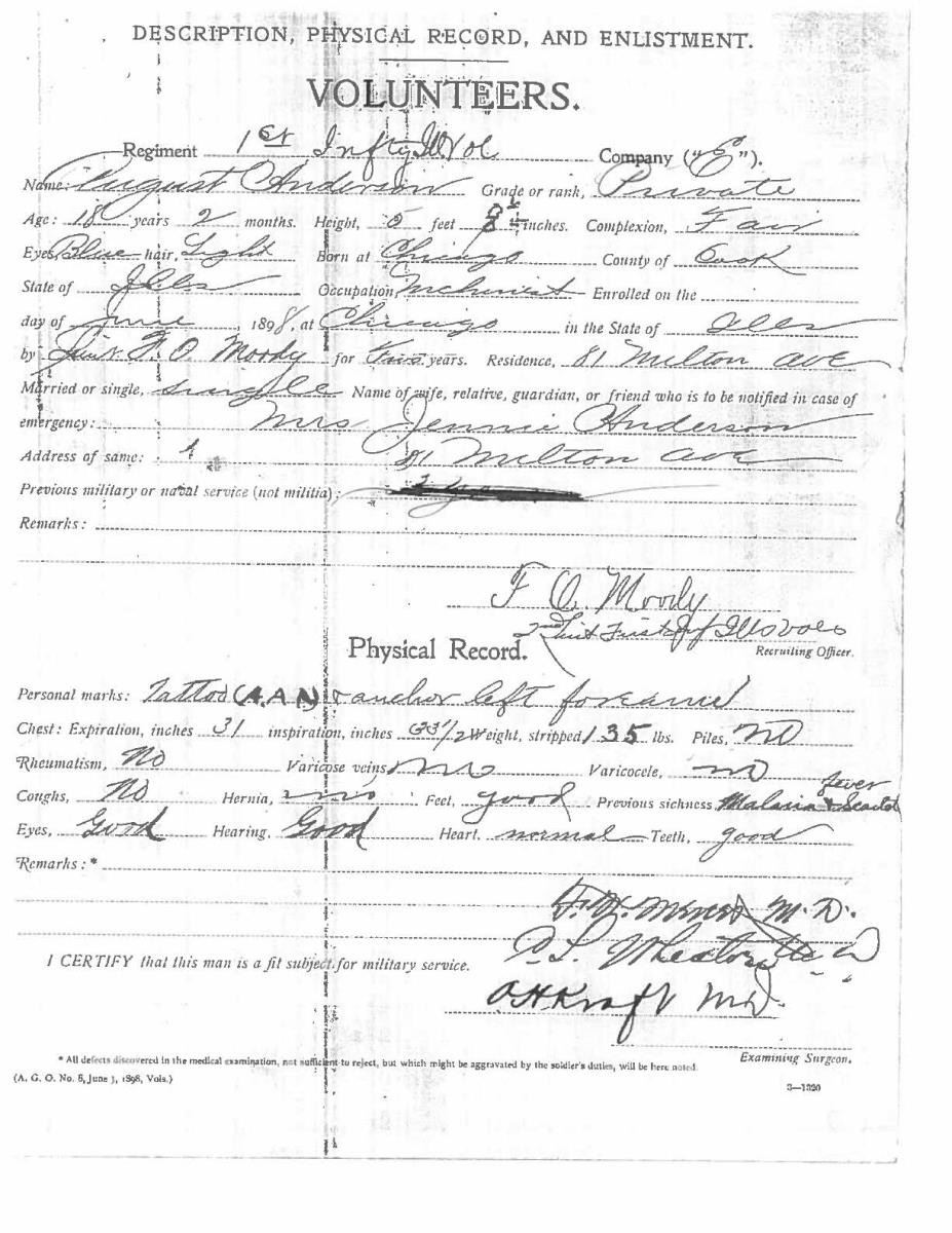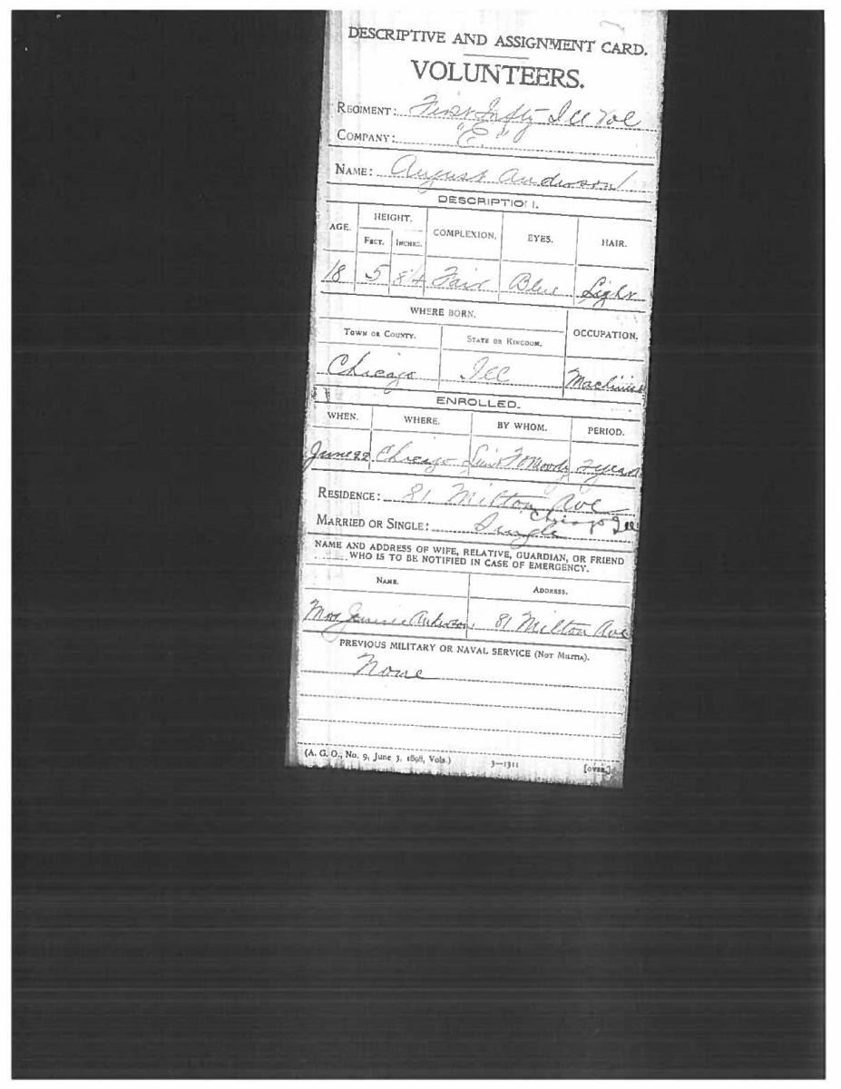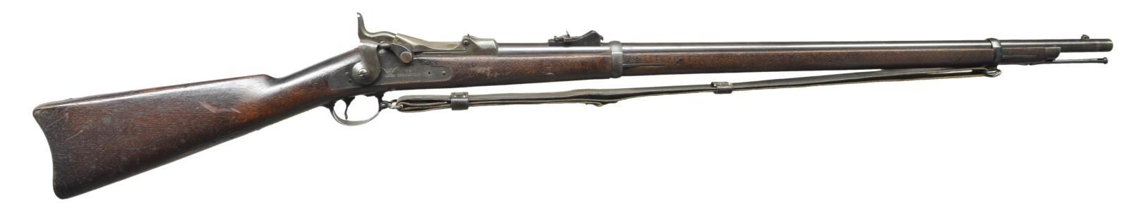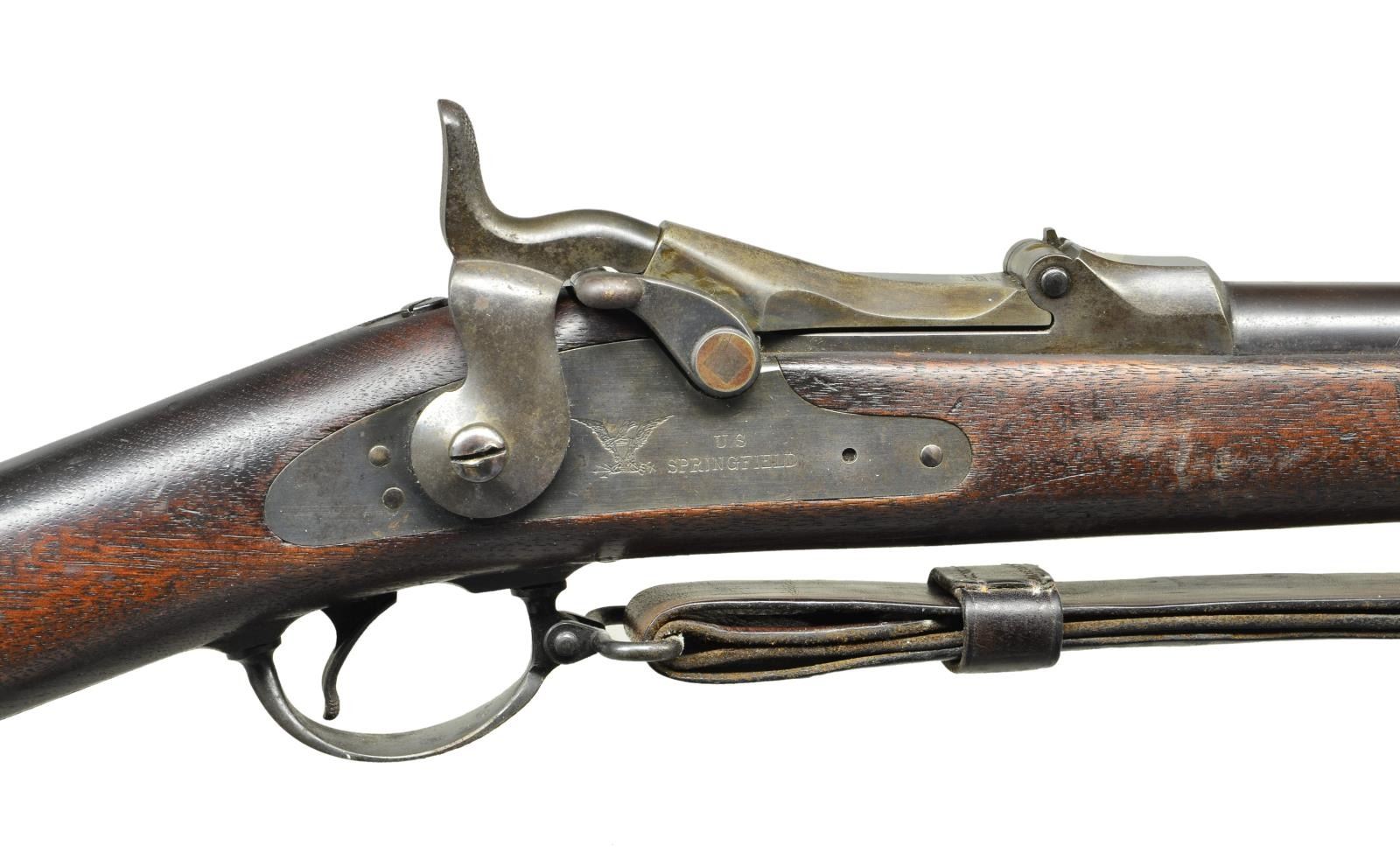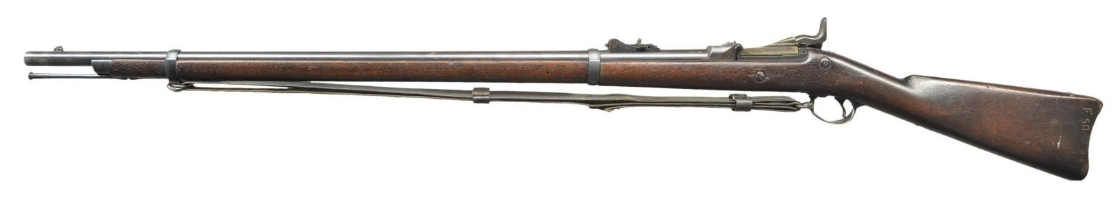 SHOT RIFLE. Cal. 45-70. S# 254474. Bbl. 32 5/8" with pinned blade front sight and Model 1879 graduated leaf rear sight. Low arch case colored 1873 dated breech block. Springfield lock. 2 Band walnut stock with slotted tip ramrod and original leateer military sling. Left side of stock has a sharp 1884 dated cartouche. Toeline of stock has circle "P" firing proof with "M" inspectors mark. Left side of butt has rectangular stamped "DETROIT / BOARD / OF / COMMERCE". Left side near buttplate also has hand carved marking "F.50." UNATTACHED ACCESSORIES: 8 pages of printed information from Springfield Research attributing rifle to Private August Anderson, Company E, 1st Regiment Illinois Infantry. Research shows this rifle was with Private Anderson in Cuba during the Spanish-American War. CONDITION. fine. Barrel and action retain 70% lightly worn blue showing dark spotting. Breech block shows some lightly visible case colors. Original stock finish shows wear with scratches, marks and dents. Bore is bright with strong rifling showing a few small spots of very light pitting. (01-21401/DS). ANTIQUE. $1,200-1,800.