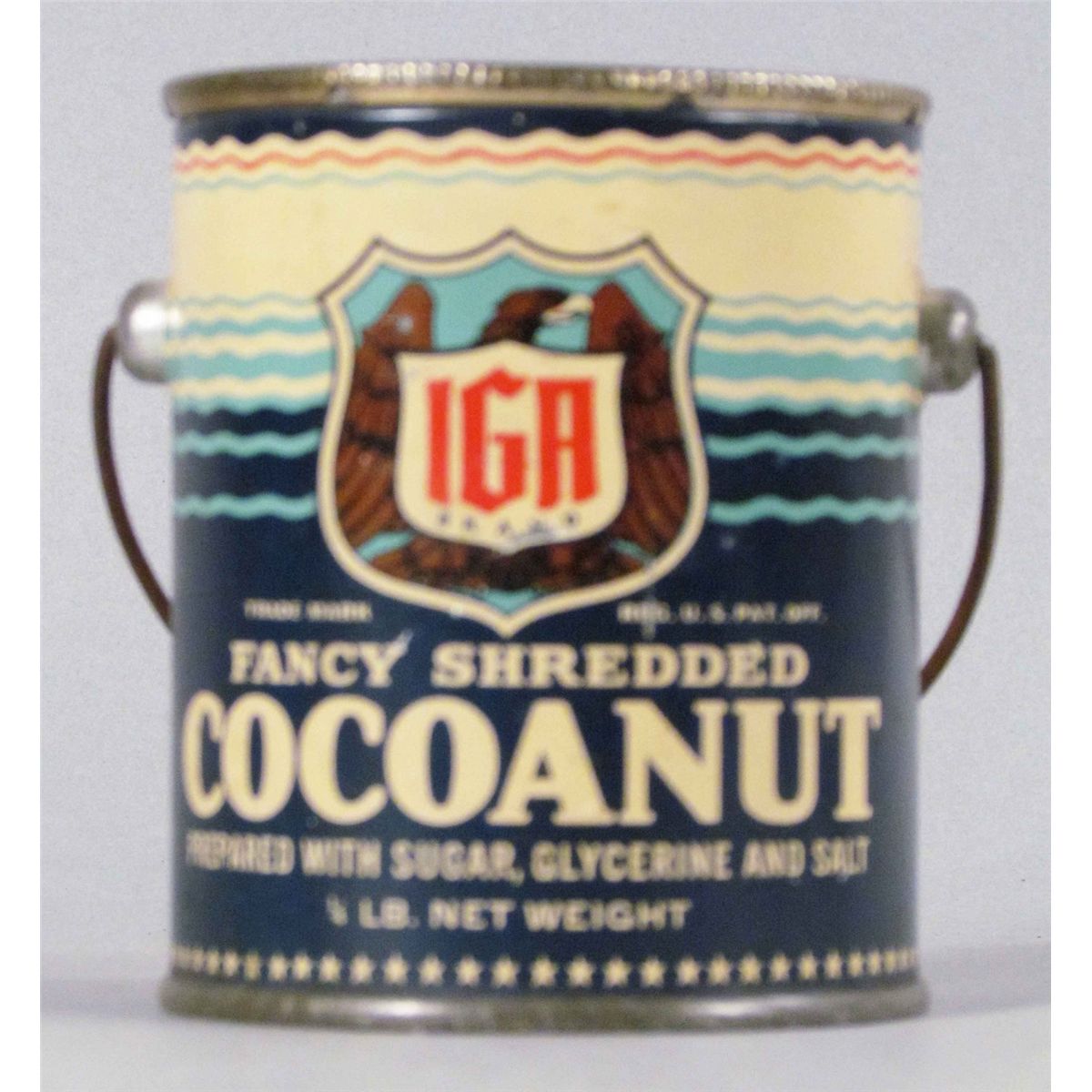 IGA Fancy Shredded Cocoanut Pale. Original paper label with embossed lid. Excellent condition. 3 1/2 inches tall w/o bale. Start Price $30