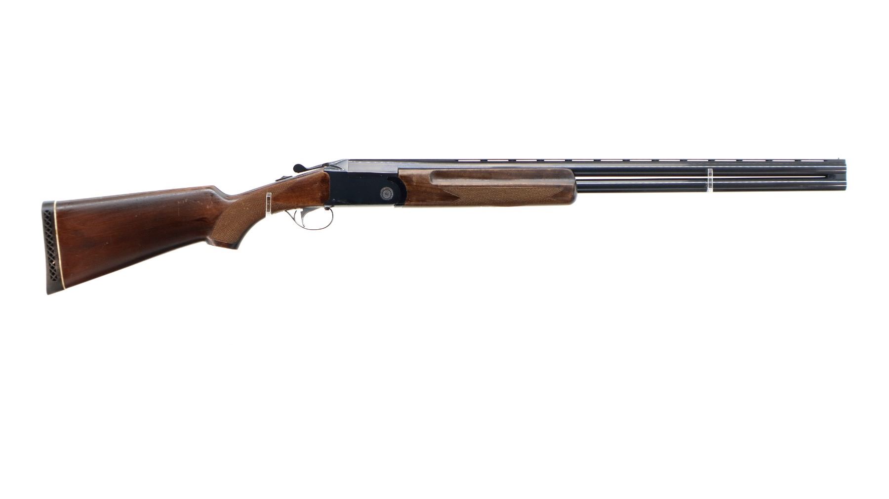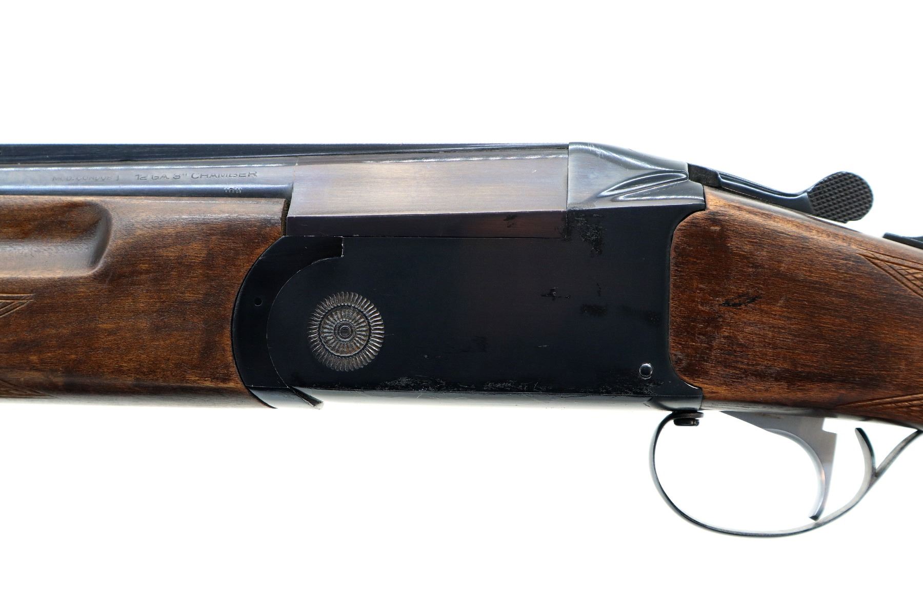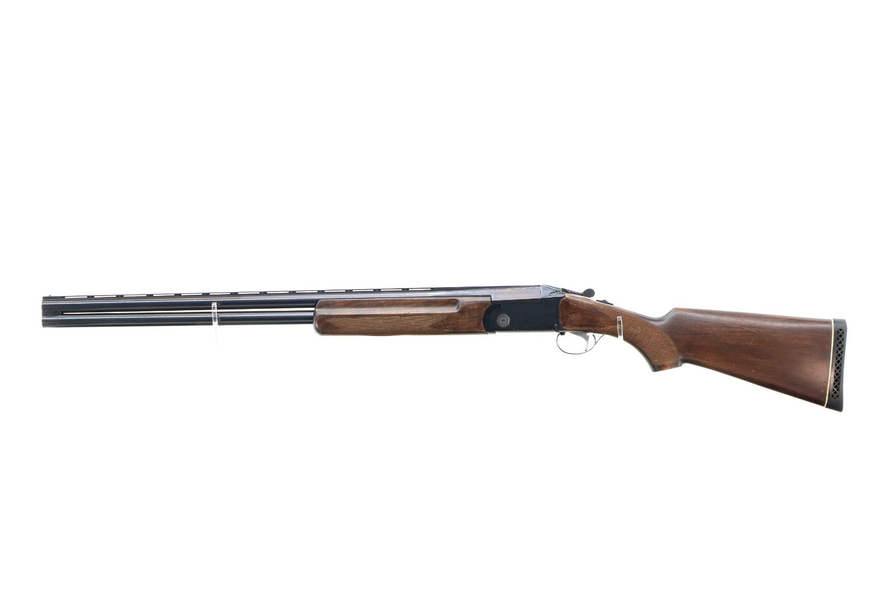 Main Description: Brass bead, blued finish, vent rib, manual safety, extractor, single mechanical trigger, note: appears to have a loose part in the receiver. Two piece wood stocks, finger grooved checkered forearm and pistol grip, black vented rubber recoil pad.