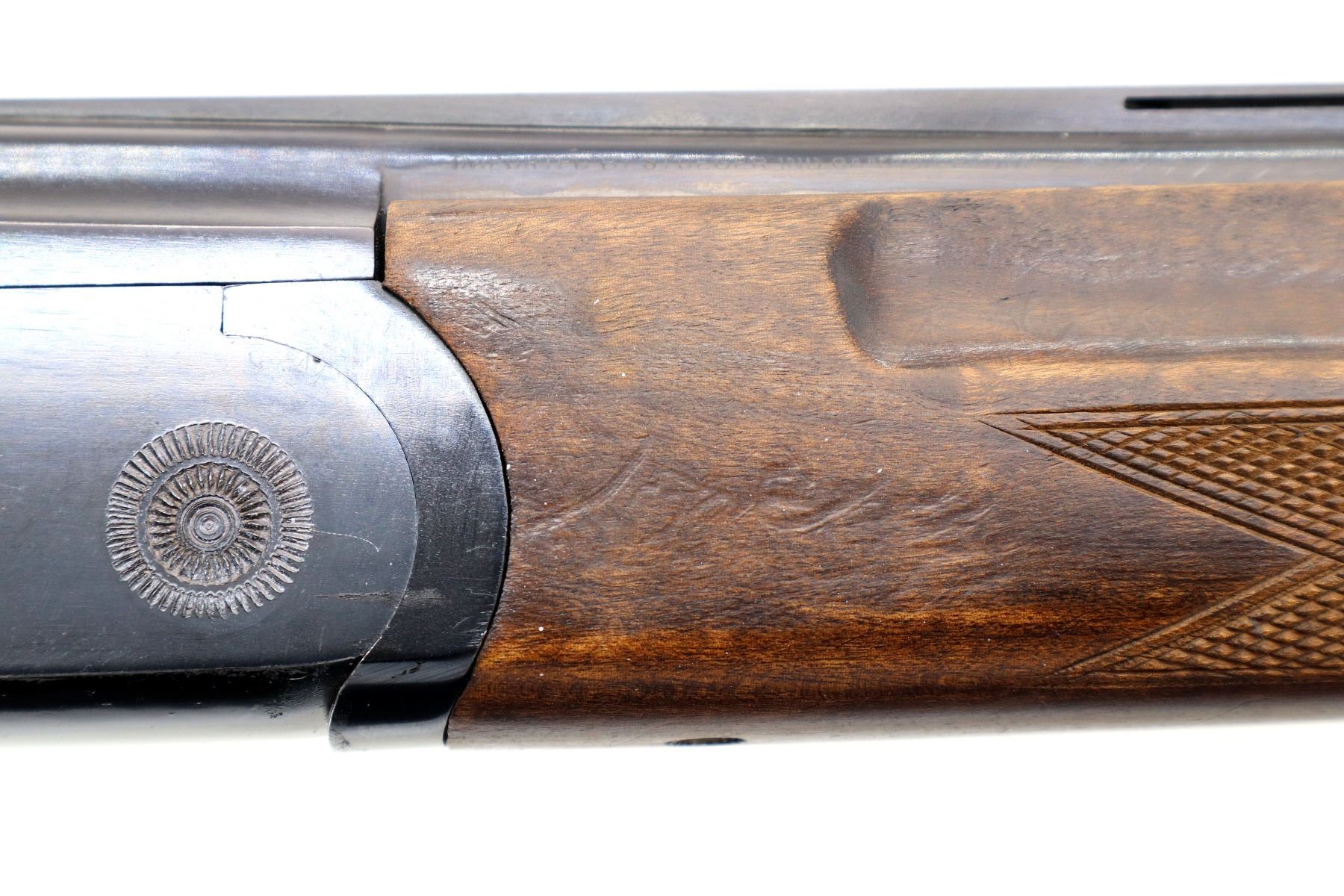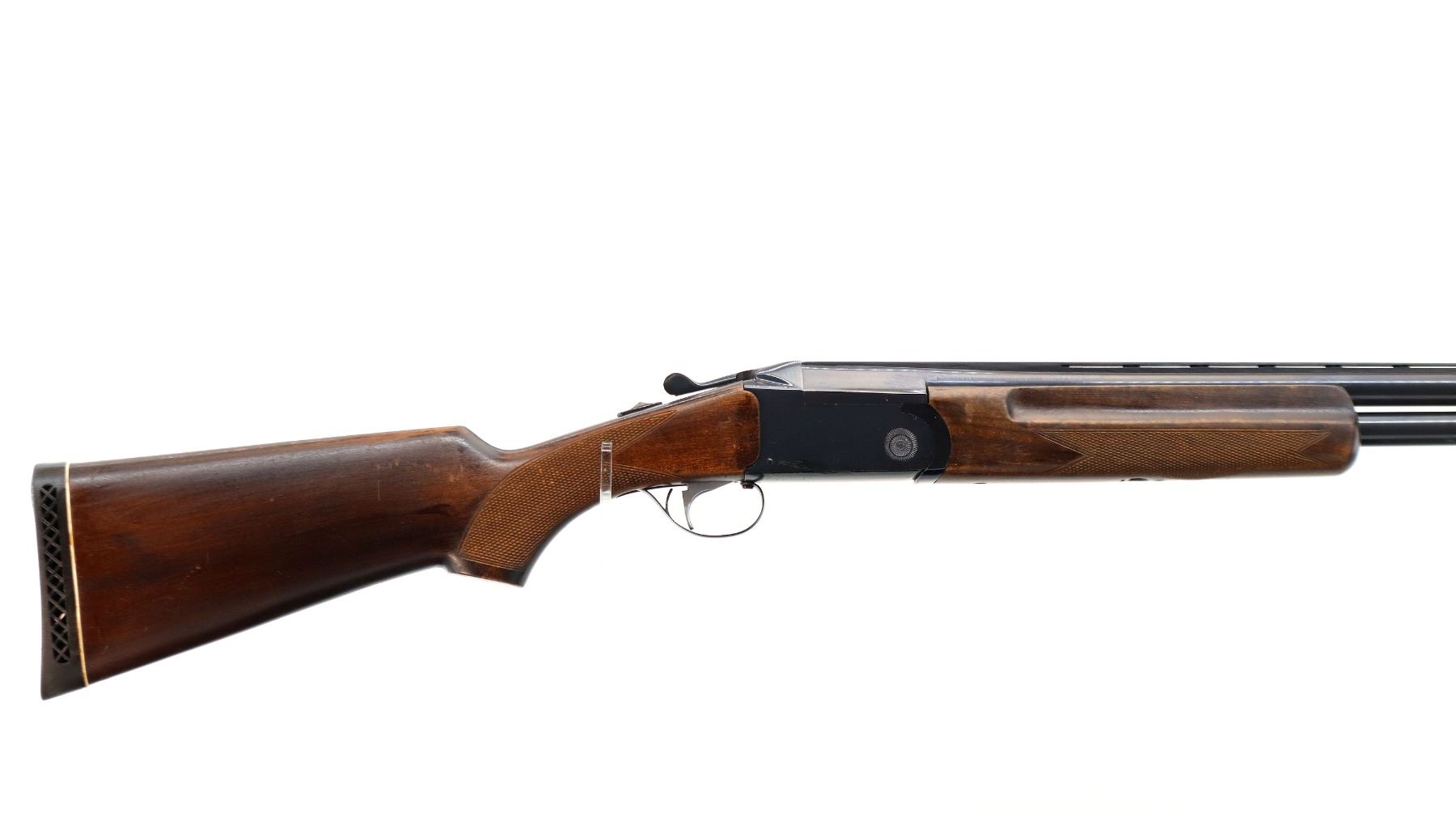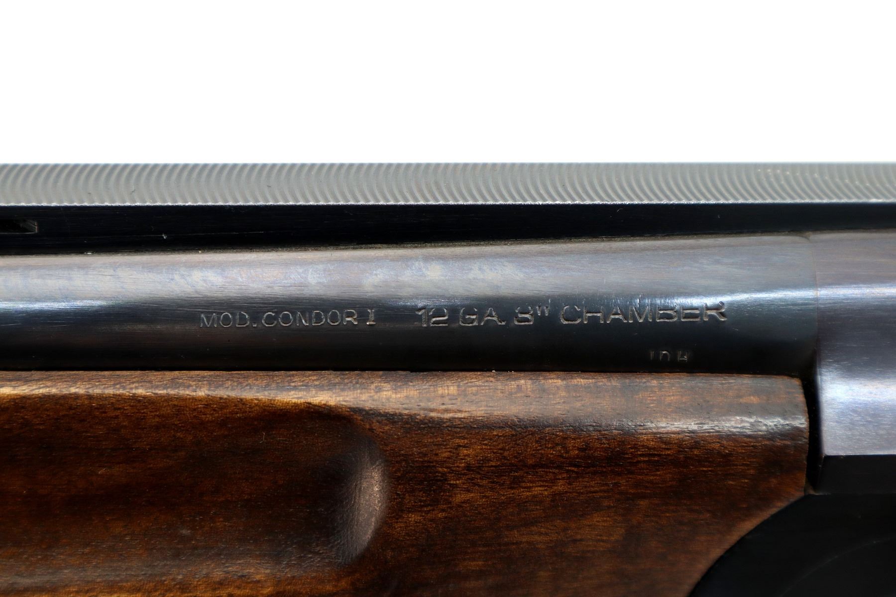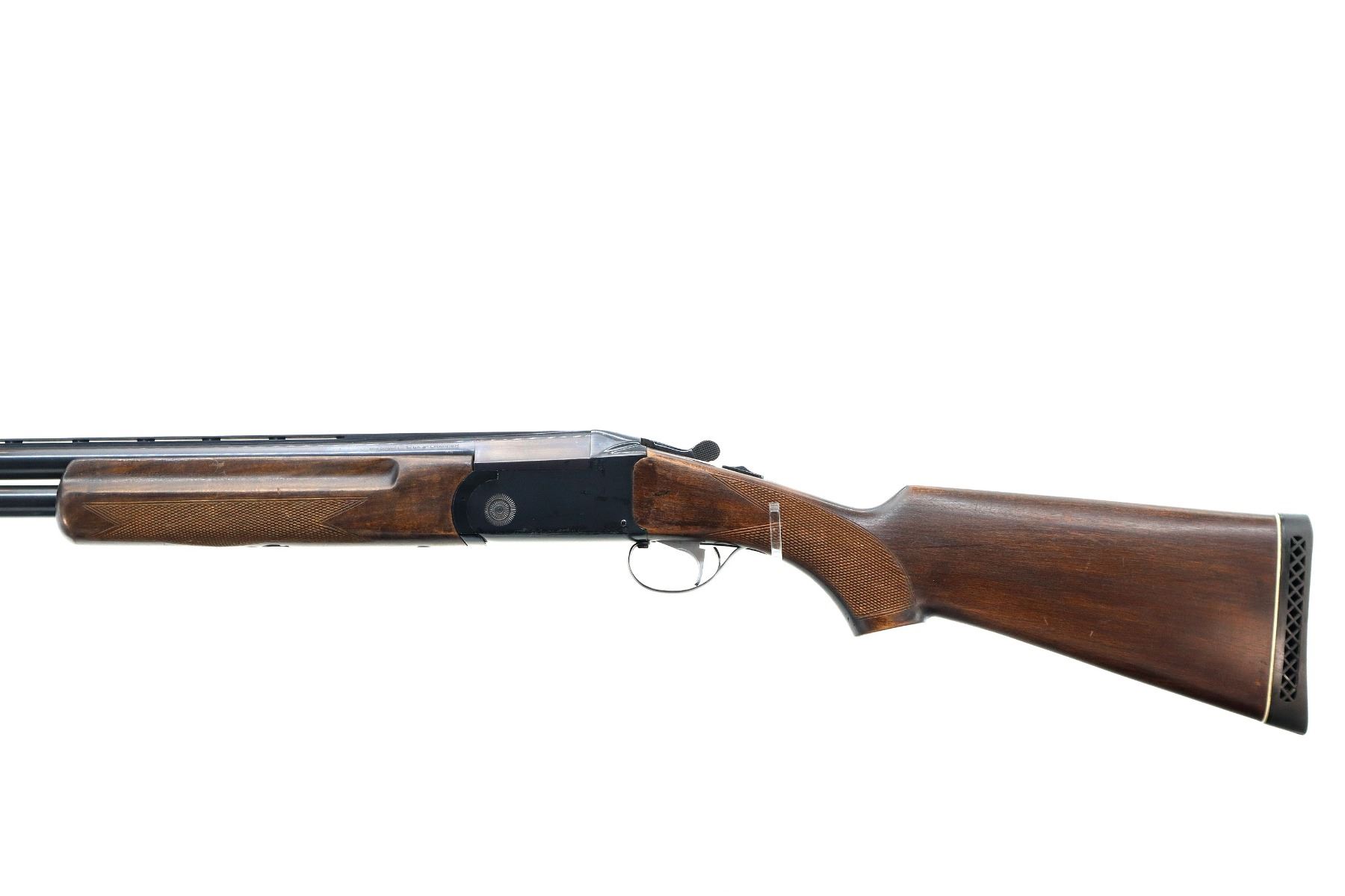 Main Description: Brass bead, blued finish, vent rib, manual safety, extractor, single mechanical trigger, note: appears to have a loose part in the receiver. Two piece wood stocks, finger grooved checkered forearm and pistol grip, black vented rubber recoil pad.